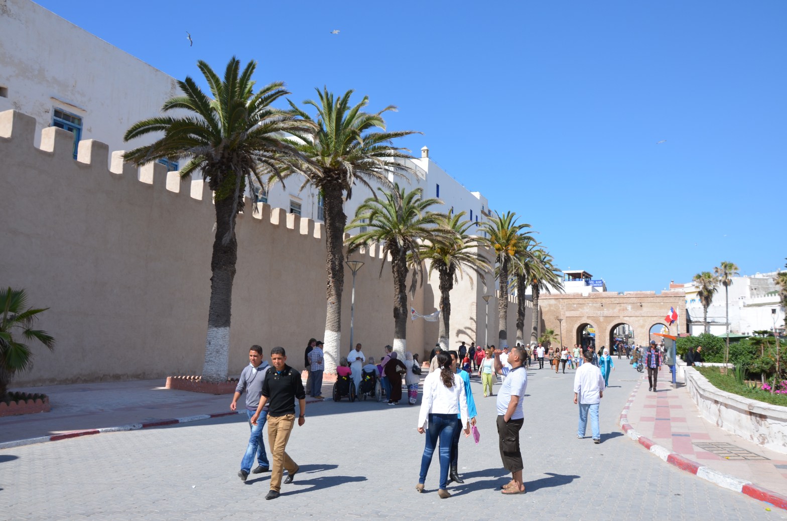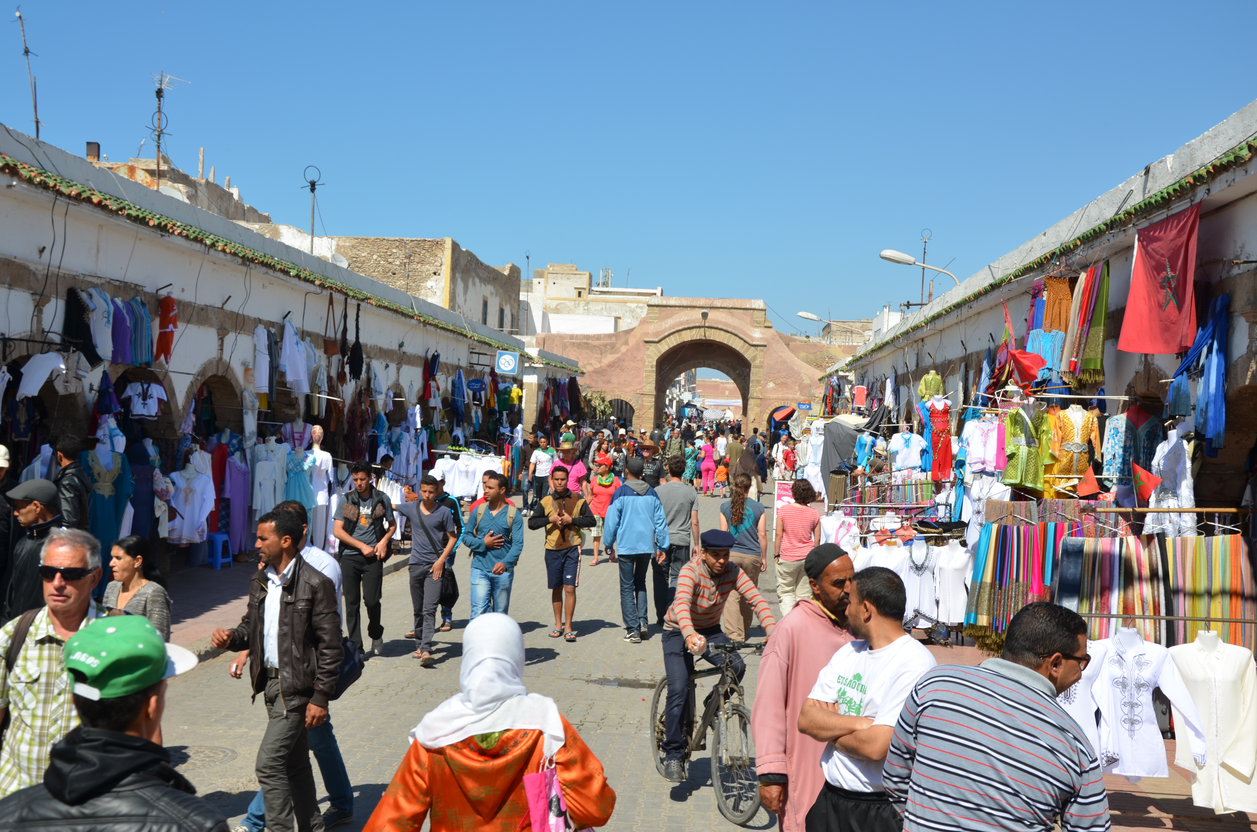 The road went straight most of the time until I reached the bay of Essaouira, where plenty of kites and windsurfers dotted the sea. Plenty of posh restaurants lined the beach and I got hungry. At one I stopped, parked the Mini in front and got a table on the terrace, between an Italian couple and some German ladies with a quite rude slang. The Italians were complaining about the food, the Germans about the beer, and I enjoyed my fish and some white wine. Before leaving I took a walk through the old town, an UNESCO site. After the crowds and hard selling of Marrakesh it felt very relaxing, and I was just thinking about an ice cream when some birds dropped their load all over me. A friendly shopkeeper helped me clean up with some water (and then showed me his shop). I heard it brings good luck and preferred to see it that way. Back in the car I changed my t-shirt and left this beautiful little town on the beach.