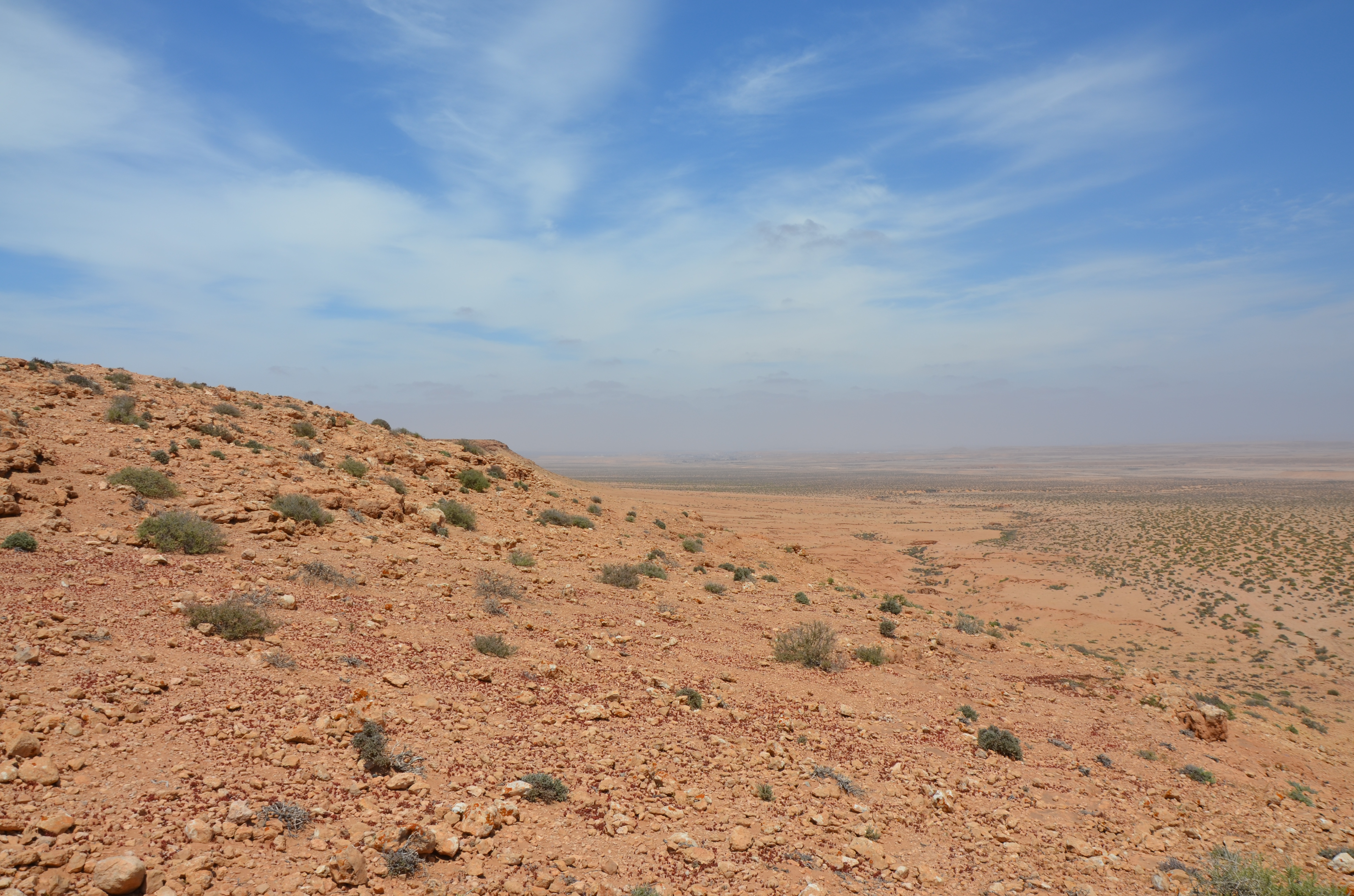 At the second police stop in Samara the office asked not just for the passport, but also for the yellow “fiche”. I couldn’t find it, and then remembered how I handed it to the police in Layoune and couldn’t remember to get it back from them. What to do? Drive back 150km and forth 250km and loose 3 hours? For a piece of paper? It didn’t make sense, and I moved on, but had a bad feeling. These stupid formalities are a delight for border guards. Especially in a country where bribes are everywhere and if you have to catch a ferry at a specific time, something the police officers know and might use against you. Anyway, the rest of the day I spent driving hundreds of km north, mostly in straight line, through a changing landscape. At the beginning it was all light brown, sand and stone desert. It got less sand and more stone over time, then darker in color. Every now and then a high, flat-top mountain appeared. There was almost no vegetation. Again I crossed the theoretical border into Morocco without noticing it, it seemed like one country. Just the police controls with passport check reminded me there was some sort of higher security. In the north police juste waved cars through mostly.