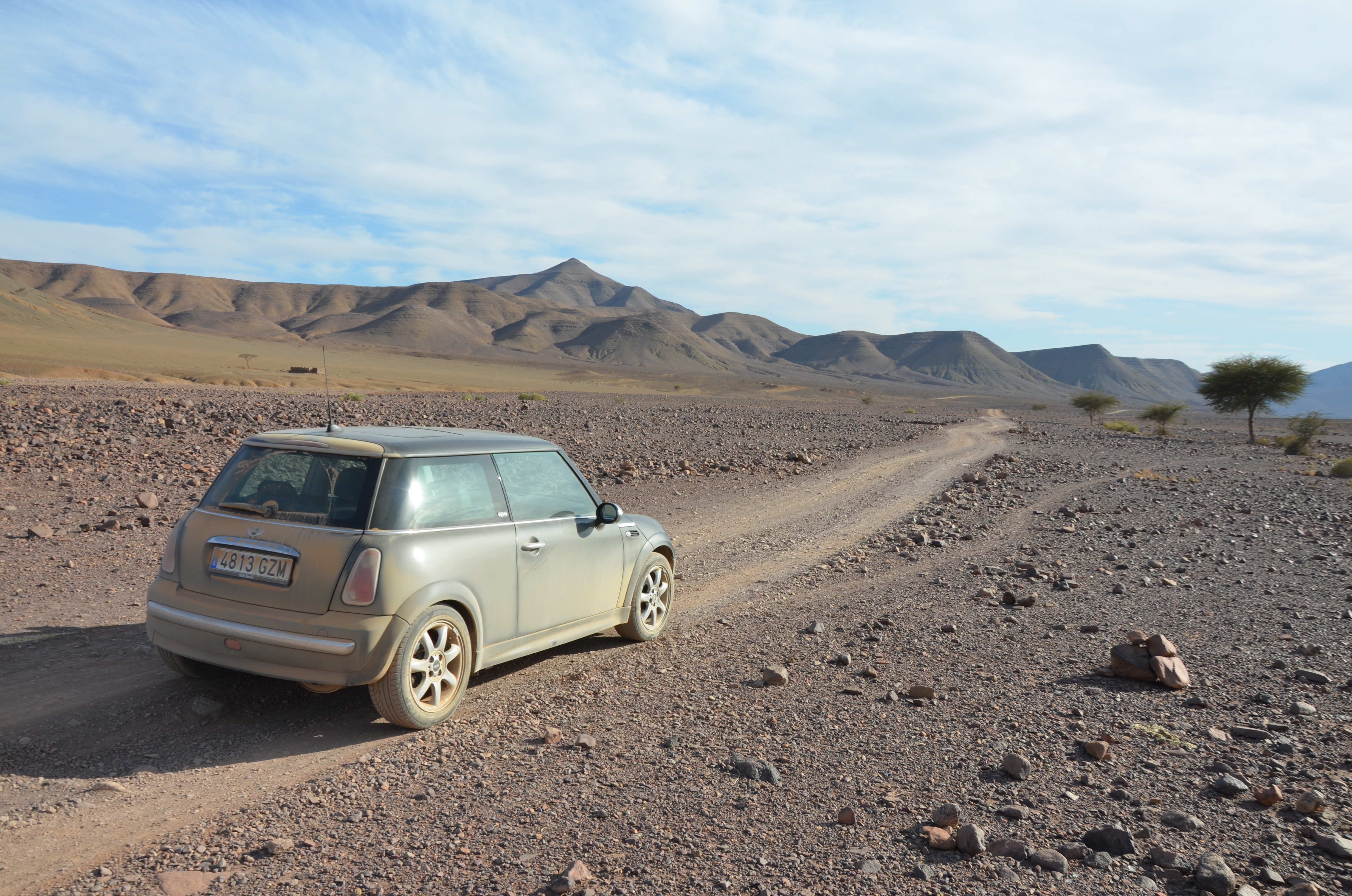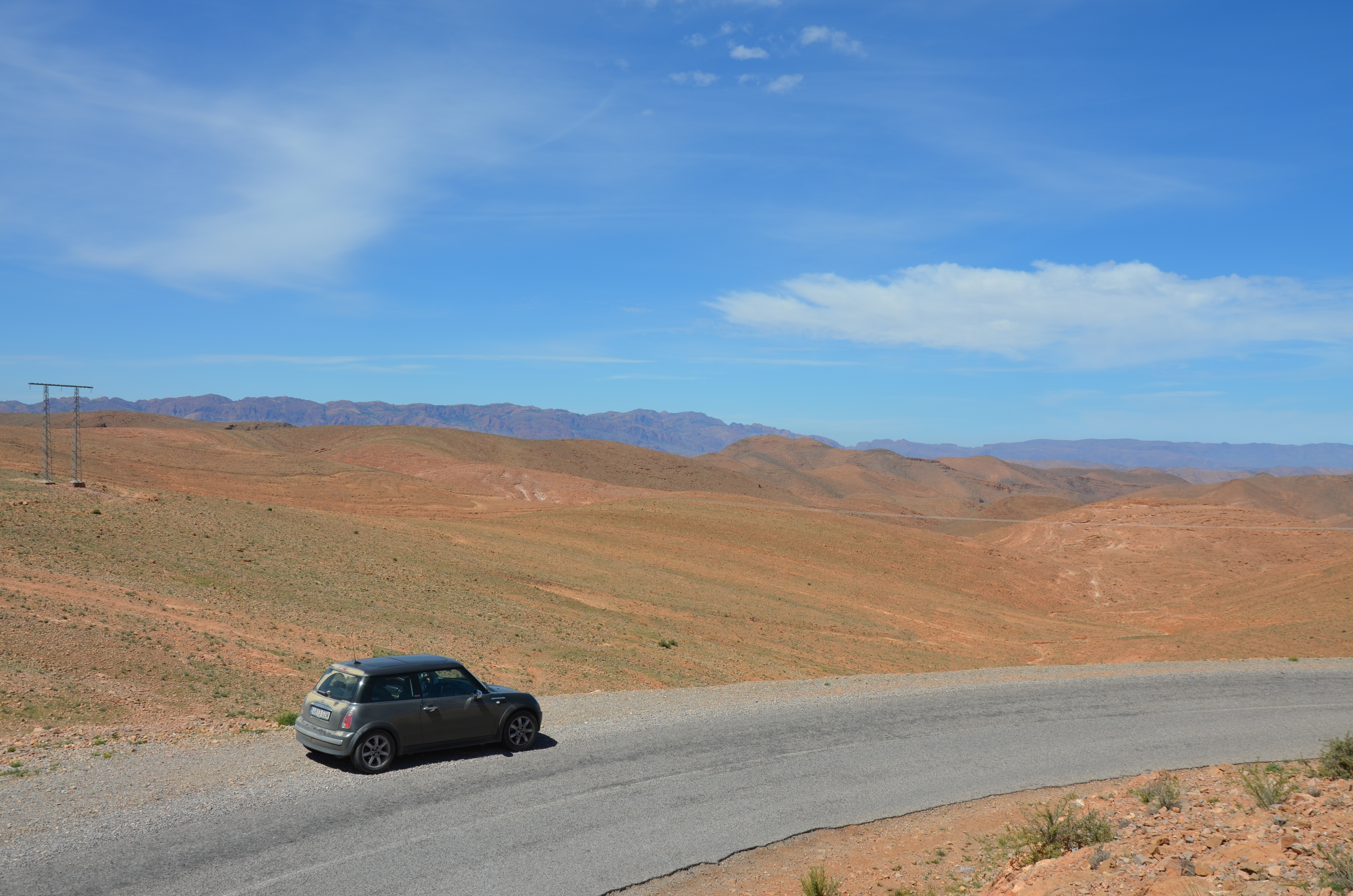 I had planned to reach the dunes at Merzouga today, and knew it would be quite a ride. So I checked several possible routes and chose the straightest one, avoiding small roads. At Tazenakht I turned southeast, towards Agdz. 20km after the village the road suddenly changed into a sand and stone track, there was construction going on. And on and on and on, it didn’t stop. I kept driving trying to avoid holes and stones, with the Mini just a few cm over the ground I could feel every hit on my own back. I checked the map on the iPhone constantly, not believing this was the right track, but it seemed so. Until at one check the location indicator showed to be off the road I was supposed to be on, and quite a bit actually. I was lost in the Atlas mountains, on a road on none of my maps that was just being constructed. No people around, no vehicles, and me in a Mini on a track that was made for a 4WD. After an hour hoping to reach a better road in the right direction I saw I was approaching another road, that the map on the iPad revealed. I almost missed it, since it was even smaller then the one I had been driving on so far. And it had more stones, I had to cross a dry river bed every 10 minutes. Every sand field reminded me how I got stuck in the Aral lake, every stone that hit the car from below felt like on the Pamir Highway, on the stone track I often lost traction on one side of the car and had a tough time steering. It took me another hour of this madness to get back on a normal road. I crossed two villages made of mud bricks, with no roads, and many curious looking people. I tried to look at the bright side: I would have never seen such a remote place had I not got lost today. The downside was that I reached the same road I had left after lunch at 18:00, and should have been 300km to my north east.