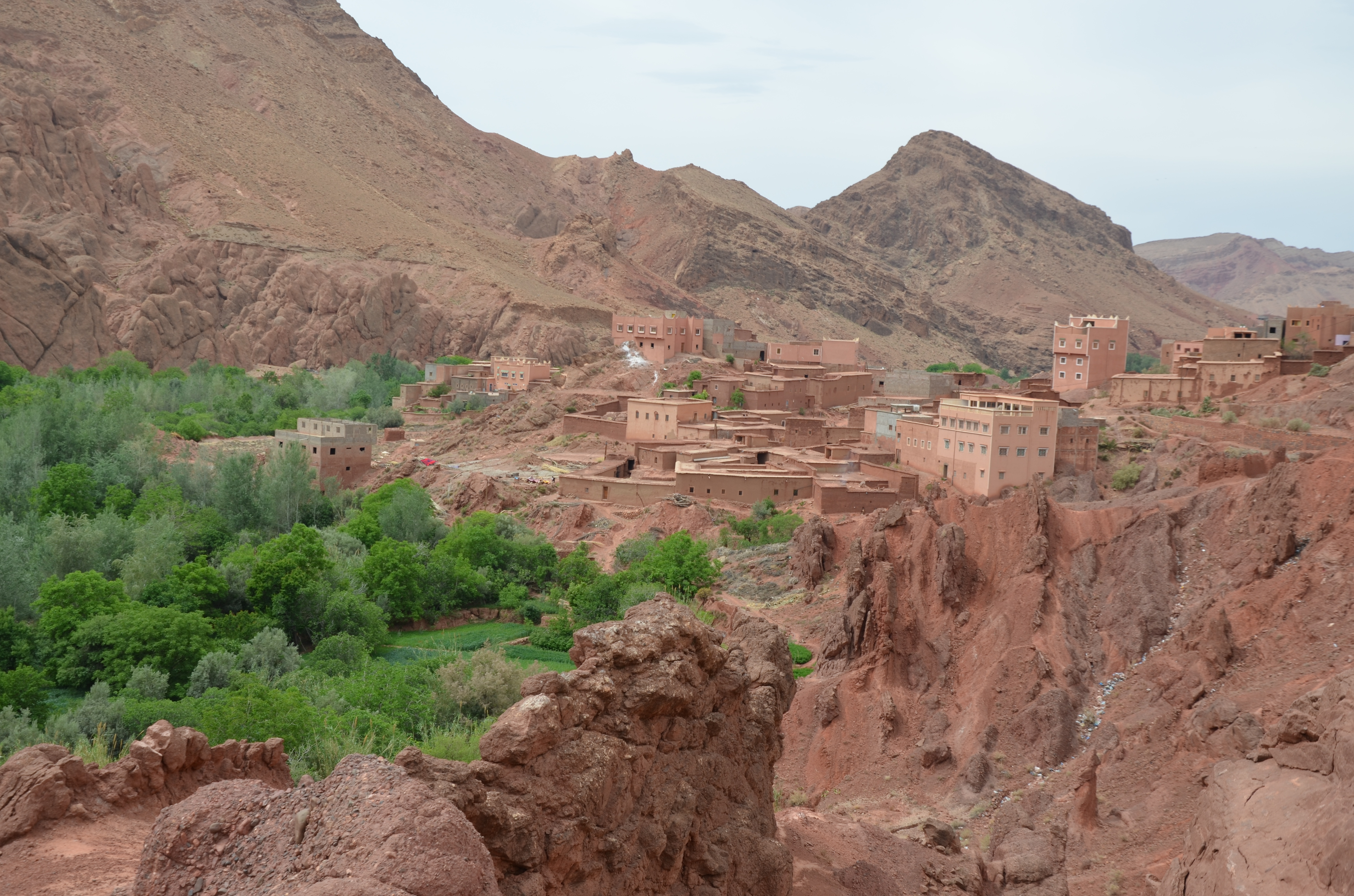 The valley after Ouarzazate was littered with tourist shops, restaurants and hotels, so I drove through as quickly as the local traffic permitted. Once the road to the Gorge left the main one the tourist trail got even worse initially, but diminishing the further I drove into the valley. Surrounded by steep red and brown mountains, the Dadès valley was a green line at its bottom, with many berber villages made of mud brick houses, a beautiful view. The road leads gently though the valley, until at some point the Gorge gets narrower and the road climbs up steeply in S-curves. It seems made for sporty cars like the Mini. In the narrow Gorge the road then climbs down again, and after a few km the narrowest point is reached, where the road and the river are the only space left between the two mountain sides! Beyond that point, the road gets a lot worse, with un-tarred stretches, and later just a sand and stone track that climbs into the mountains. The map showed this as a normal road, so I kept trying my luck hoping the road would get good enough to cross the mountain. But it didn’t, and the poor Mini had to get his offroad capabilities tested again.