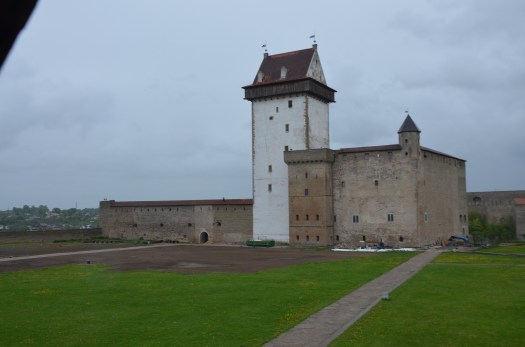 Back to the road. The closer I got to the border with Russia, the darker the sky got, and it started to rain. I appreciate the free car wash, as the amount of insects and dirt is getting a bit too much, but visiting places sucks this way. As I drove into Narva, the border town between Estonia and Russia, I expected to see any sign of preparation for the threat the Russians apparently pose to the Baltic states, reason they joined NATO and hold war games around here. Big disappointment, the scariest thing the Estonians put to their defence agains invading Russians is the depressive Old Trafford pub on the square in front of the border station. And I had hoped for lunch around here… There’s a medieval castle on a rock on the Estonian side that looks very much like the ones I built with Lego as a kid. And right across the river there’s another one, the Russian side. Two massive castles staring at each other, symbols of conflict since 1492. I toured the Estonian castle in the rain, it was cold. As I entered the inner part through a big wooden gate, a babushka came towards me with an umbrella, very friendly, and “please, please” lead me straight out of the castle again. After I had exited, the showed me the entrance would close at 18.00, it was 17:20. “Kassa close five.” OK, I understand with the hordes of tourists you get on such a busy day and considering the vast amount of things to see around here you really need 1h to get everybody out on time. I was the only visitor.