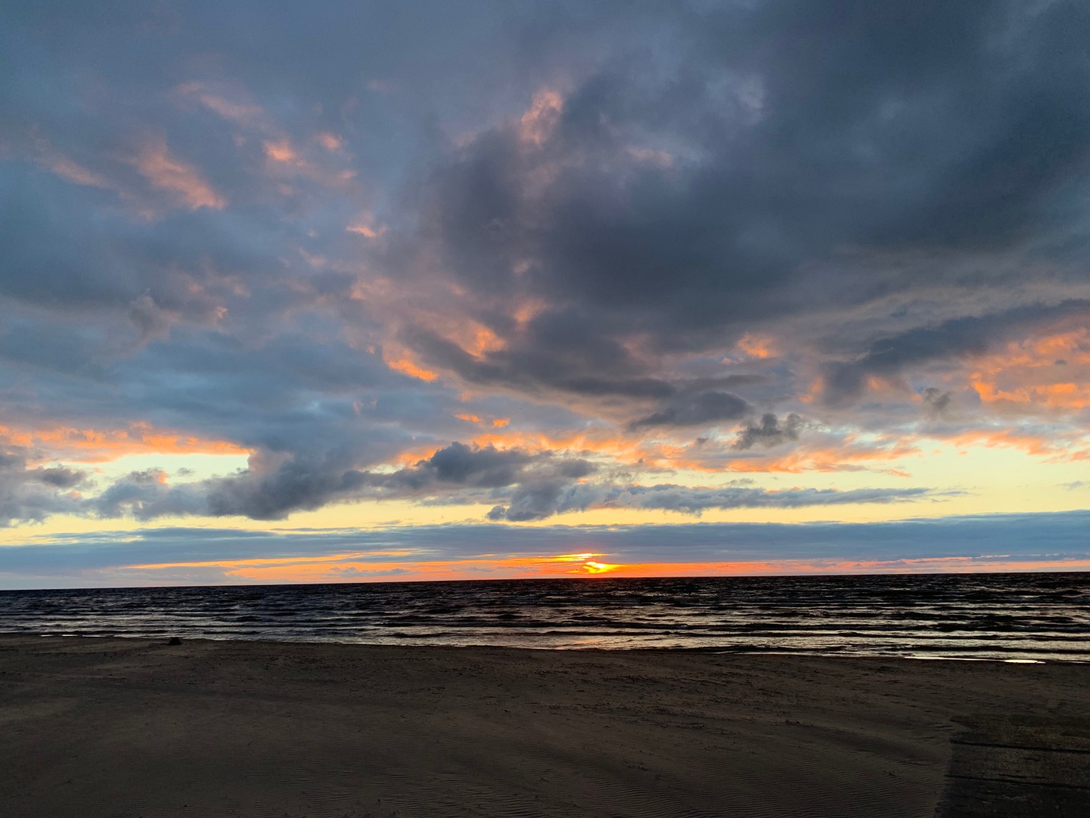 The day was getting late, and the road ahead still long, so I had to rush. Overland towards the Latvian border there wasn’t a lot of excitement, and it rained on and off. Also in the Baltic states bikers use motorways for excursions, sometimes a dad even takes his daughters for a family trip on a weekend there. The crossing into Latvia was easy, no border, just a road sign and 2 mins of 4G downtime as the network switches. For a fraction of a second I thought about the hours-long border crossing that I would have had to face if these countries were not in the EU. And in the EU there are people that want to “take our borders back” and put that crap back up… Insane, good luck to the British. At Panevezys (that sounds like “bread and veggies” in Italian, otherwise I couldn’t have remembered the name) i had left the main Vilnius-Riga road, and the smaller one was also a lot less tarred. The Latvian sire was very bad, like a mosaic of potholes and tar patches of all shades of grey. I started to notice ruins of what probably must have been bigger buildings or walls pre-WWII. The sun started to go down, and the window full of insects and road dirt isn’t the best sight with the light against it. but the more north I got, the later the light disappeared. I reached Jurmala, Riga’s beach town, in the last sunshine. It is a beautiful collection of datchas in the pine woods. In a way it reminded me of places like Fregene at the beach in Rome, same concept and town layout, similar pine trees, different architecture, better weather. I checked in at the hotel and asked for dinner. “Too late, it’s already 21.00”. Ouch! “But let me call a place I can recommend.” Very friendly from the receptionist. She put the name into Google maps and said “you have 10 minutes before they close the kitchen.” OK, so off I went. I reached the parking lot dotted with Bentleys, Porsches and other high end German cars 7 mins later and ran straight to the beach. The sea air was wonderful, the wind in my hair, and the sun going down on the horizon – I got emotional for some reason. After 10 days and 5.500 km overland being back at the water, and not just a lake, felt just good. At my table at the very chic restaurant everybody spoke Russian around me. Dinner was spectacular, but the sundown over the sea took all the attention.