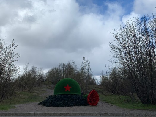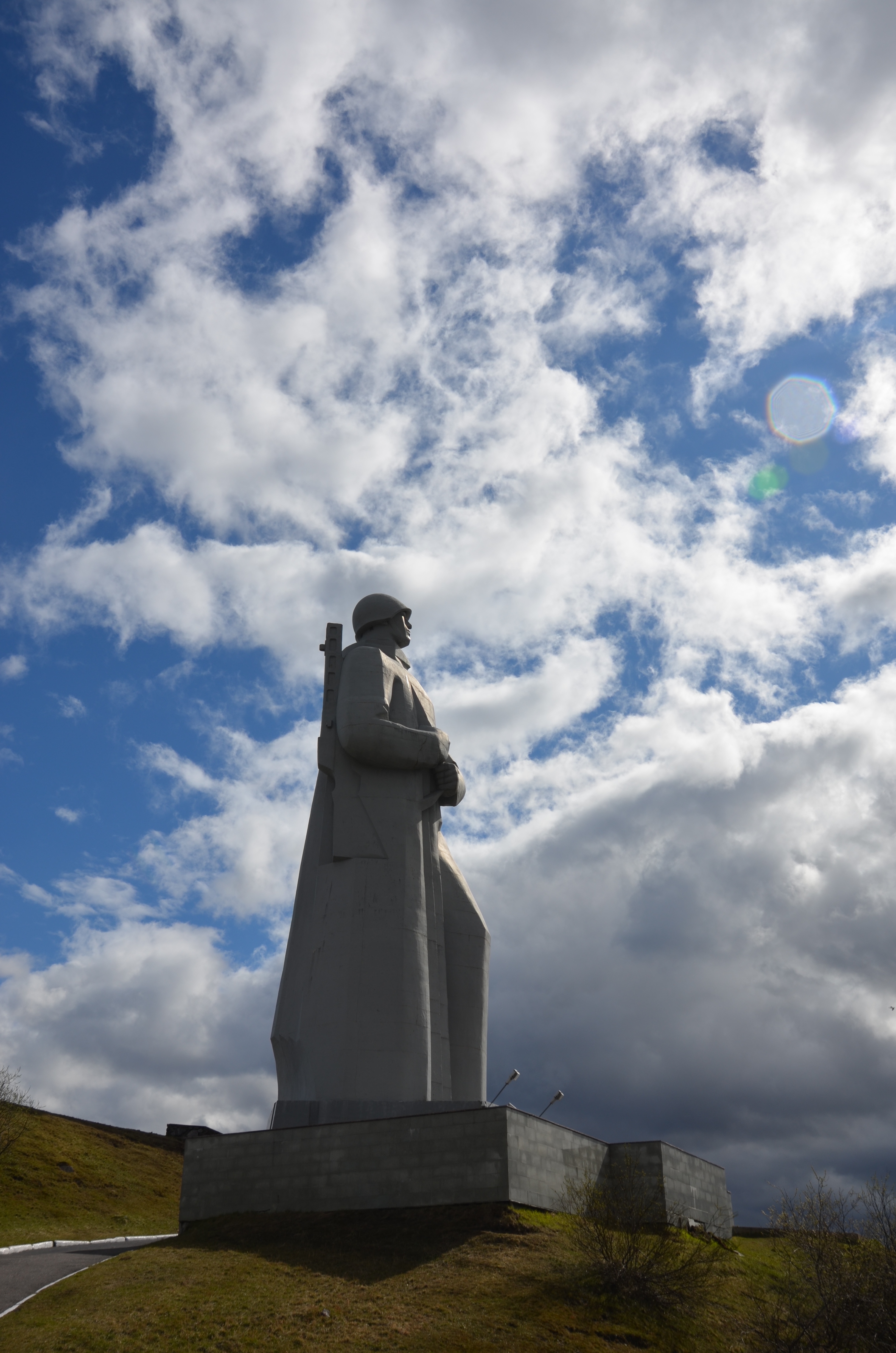 Entering Russia the road was brand new and perfectly tarred for several kilometers. The landscape was the same arid tundra as in Norway. I left the highway to take a detour on a smaller road. The old Soviet border post was now abandoned and got a make over by sprayers. Right after it was the first of many WWII memorials of the day, this one with a bright green howitzer and fresh flowers. The smaller road lead through what seemed a military zone, on both sides of the road there were triple barbed wire fences, floodlights every few meters, cameras and other equipment. From afar I could see the chimneys of the mine in Nikel fuming. Against the background of a bright blue sky on this sunny day, the factory was in stark contrast. The closer I got, the clearer the man made destruction of the area became. The ground was black. The ice fields on the slopes of the hills were black. There were mountains of black sand all over the place. The dams of the roads were black. The trees were black and looked like they had burned. Debris and trash were everywhere, as well as man made massive mounds of rubble. The town of Nikel is an agglomeration of Soviet residential blocks made of prefabricated panels a log time ago. In the middle of them is a huge mine or factory that looked pretty desolate and crumbling from afar. As I kept driving, more mines came up, and the mountains turned up to be a mostly man made accumulation of grey and black gravel with square black silhouettes. I drove for about one hour through this wasteland. The scale of the destruction of nature was baffling. The next town was a military garrison, with lots of trucks of all types standing around neatly parked, and also some covered up tanks and APCs. Soldiers where everywhere. Same thing in the next town, Sputnik, just bigger and with more vehicles. The following town was mining again, and one more of military. This is border and frontier territory, things are rough around here. Most buildings and shacks were from Soviet times and crumbling. One more passport control passed with no further issues.