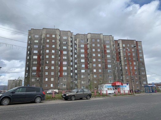 I reached Murmansk at about 13.00. Down a hill, the city opens up along the other side of the river, and is an endless row of docks, factories, ships of all shapes, sizes and ages. The bridge across the river looked modern from afar, but driving over it revealed a patchwork of tar and I had to drive slalom like everybody else. Entering town, a “commercial zone” welcomed me on the left of the road. The car spare parts market was a collection of containers on a field. Then came another market of these, and more. The buildings had probably seen better days in the fifties and sixties, the Soviet tristesse was all around. Everybody was driving slalom around the potholes. At some point I had to stop at a train crossing. I waited and waited and waited as several locomotives passed in both directions, and was about to turn around as already other vehicles had done, when after 20 mins in line the crossing opened and we moved on. The centre of town had nothing interesting to offer, so I found my way up the hill to see Alyosha. To get there I had to pass residential areas and could see the crumbling Plattenbauten from closer by. Depressing.