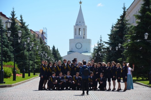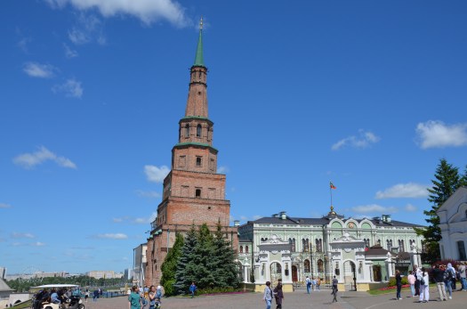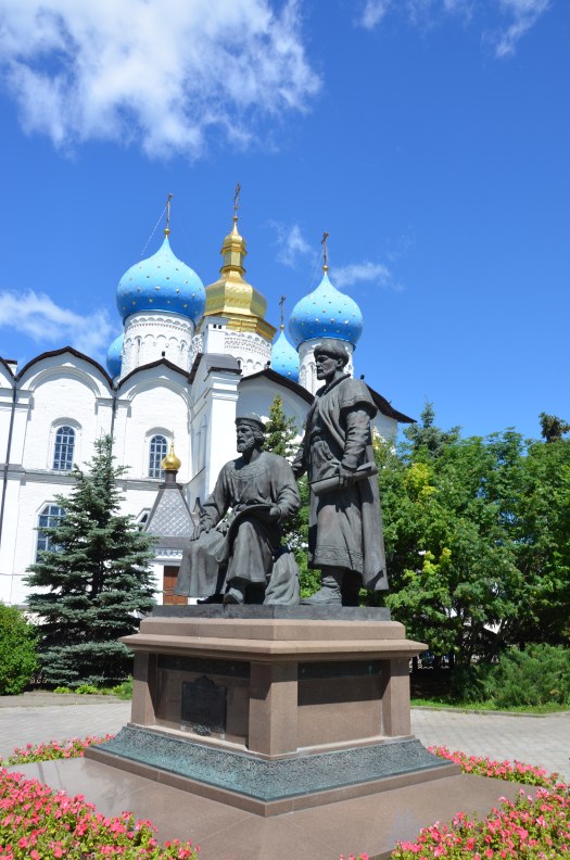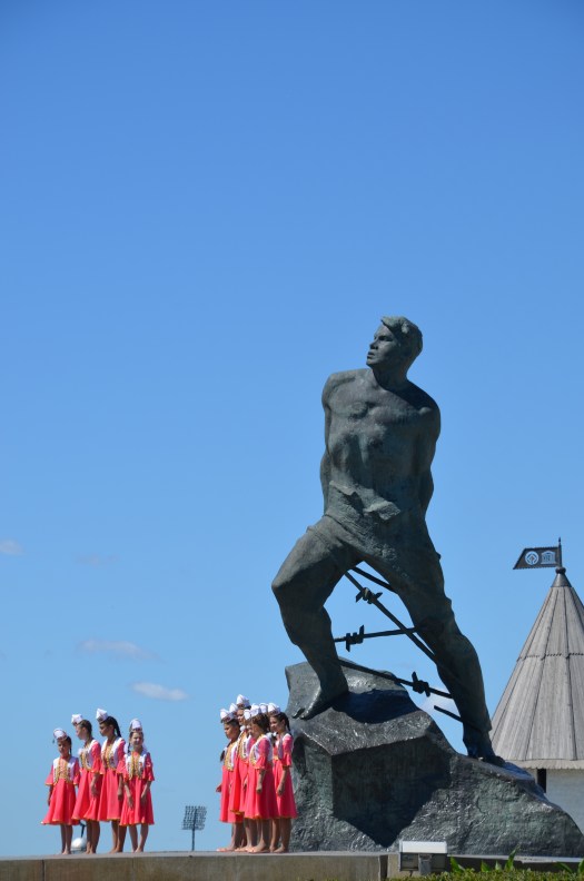 The next morning I discovered that my hotel was apparently the former building of the Tatarstan writers union. Not that this was a familiar organization to me, but the building was part hotel, part museum, part restaurant. On display were plenty of memorabilia from Soviet times, the gentlemen on the pics all seemed to be WWII heroes and on party lines with their mission as writers and poets. Sunshine and a bright blue sky greeted me outside as I went for a walk around the old town, checking out the Kremlin in daylight. It was an interesting building complex, mixing Russian and Central Asian elements, featuring an orthodox church and a mosque, but renovation had killed all old charm. The place looked brand new. At the entrance stood a big monument of a man breaking free from barbed wire. In front of it a girls choir in folklore sang a song – in playback, as they recorded a video of them. Inside the Kremlin, a group in uniforms, half boys half girls, was waiting for a tour. Some girls had taken off their heels for a break, and were freshening up makeup and hair, while the boys chatted separately. At some point an older guy came walking from a big white Toyota Landcruiser parked in front of an official building. The whole group ran to the take position, boys on one side, girls on the other. The older man said a few words, then the whole group went in for a tour, not before the girls all went to pick up their handbags. All this felt somehow archaic.