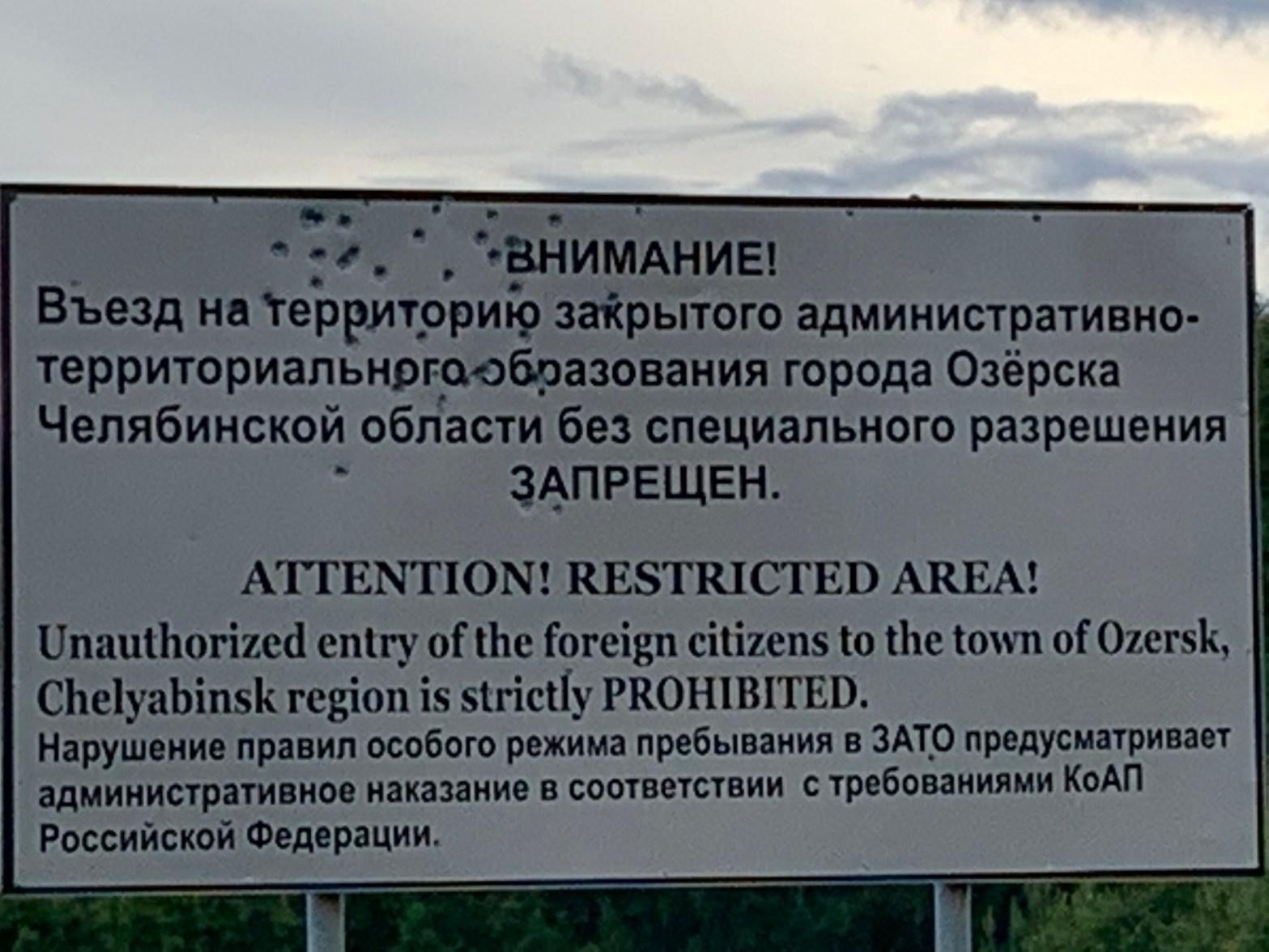 Back in the office I had to write on three forms that I denied signing. The translator had to then translate what I had written, and we all signed all three forms. Suddenly two other civilians showed up and signed the documents too. “Who are these two people, Alesia?” “Witnesses, they need to sign.” “But they just arrived, they have no clue.” “I don’t know, that’s the way it goes.” I was told I had to pay 2.000 RUB (~28 EUR/31 USD) at a bank, then Whatsapp the civilian with my visa documents a foto of the payment receipt, otherwise I could not leave the country. I got all my documents back, and five hours after stopping at the barrier I was free again. I shook hands with everybody, and off we went in different directions. Sigh of relief. Shortly after I saw a sign on the other side of the road. It was white, I wouldn’t have noticed the one small sentence in English crammed between Russian text, that indeed said the area was closed off to foreigners.