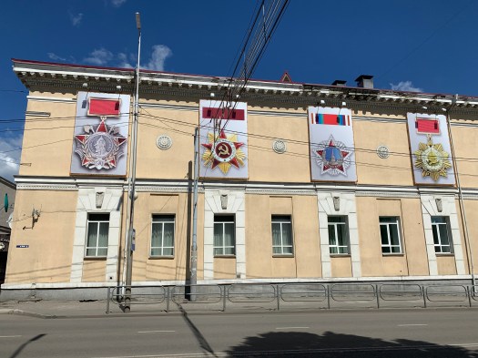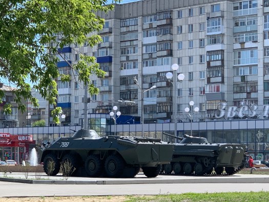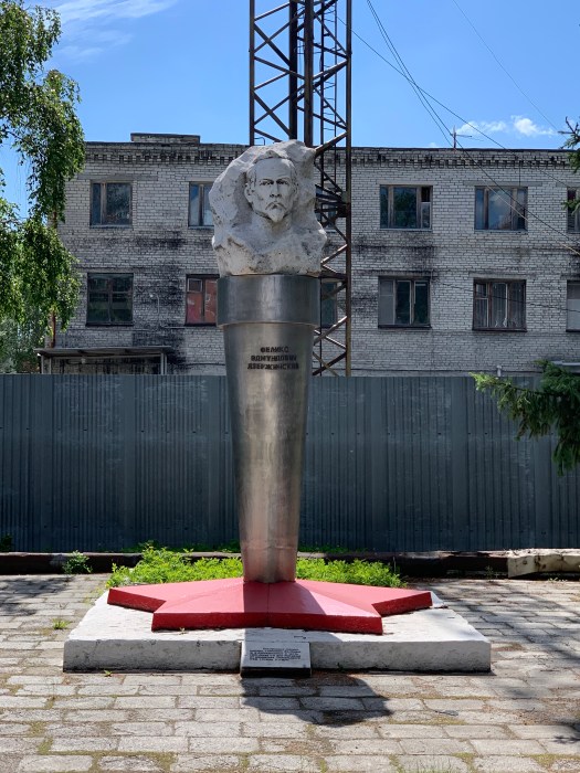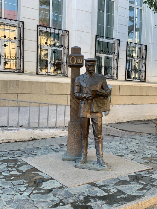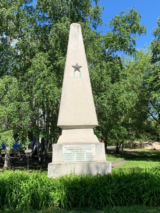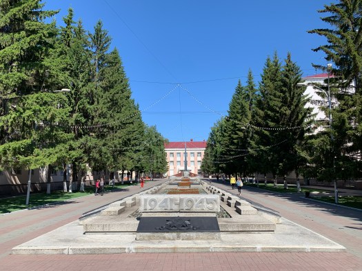 The next morning before taking off I had breakfast in the very basic hotel. I got out my few words of Serbo-Croatian I had learned many years back, and managed to get a great breakfast with everything I wanted. The lady in the kitchen laughed at my strange accent, but understood everything. From former Yugoslavia to Poland to Russia, there are so many similar words in the Slavic languages, so many assimilations of German and French words, plus a lot of Latin words in the medical sector that I understand a lot around here without speaking the language. After now two weeks of reading roadsigns, shop signs and product stickers I can read the Cyrillic slowly and guess pronounce 80% of it correctly. That helped for example understand in the supermarket in the morning that none of the stuff I wanted to buy was available, and I had to find another one. But before that, I took a walk though this frontier town. A few blocks away was the obligatory eternal flame. The obligatory tank I had already passed at the town entrance the night before. But before the flame were metal plaques bearing the names of what I guessed were the WWII soldiers from the city or area that died. A quick math resulted in about 40.000 names. Not far away was the home of a Dekabrist, in a park next door is a memorial to commissars murdered by White soldiers in 1918, some blocks further, on Ul. Sovietska, is a monument to Felix Dzerzhinsky. It seemed the Soviet Union has never ended and is still in full swing here. Several gigantic hammer and sickel monuments in various towns seemed to confirm that, as did along the entire journey the tons of Soviet insignia on buildings and cars.