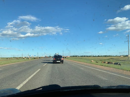 The road to the border with Kazakhstan was about 140km away. On the Russian side in about 50 mins I had passed border control and customs check. The road towards the Kazakh checks gave me an amuse-geule of what would expect me as the main course after the border: mud tracks off a road that is being constructed, decorated with deep truck or tactor grooves, littered with stones that could cut a car tyre easily from the side. The Kazakh border station was also a construction site. Waiting for my turn in a line of cars I scrubbed layers of dead insects off my front windshield. I passed the friendly passport and customs controls in under 20 minutes. The soldiers wore fatigues that resembled those of the US army, English translations appeared on signs, and the border staff even spoke a few words. As I rolled out of the border station, immediately a group of older men in military fatigues without insignia, big bellies and grey hair surrounded my car. “Green Card. Insurance. Where are you from.” I knew they wanted to rip me off. I checked my Insurance’s Green Card and indeed it didn’t cover Kazakhstan. I tried to talk to them in English to push back a bit, and see if they would drop the ball. A young blond girl got called to the scene, and started to translate. I needed to buy an insurance for the Mini. I knew the process from 2013, so I went to one of the shops selling it with her. The guys were pretty not amused that the girl stole the customer. But she was very friendly, got straight to the point (the insurance), calculated the rate for 2 weeks, 1 and 2 months based on my car’s age and a table she had, answered all my questions and even offered me a coffee while she filled out the paperwork. 55 EUR and 20 minutes later I was insured for the coming tow months and as many visits to the country as I wanted. Outside it was hot and dusty, and as I checked Instagram while waiting many pics from Italian beaches, dotted with bikinis and boats came up. I was on the verge of disconnecting from a few people…