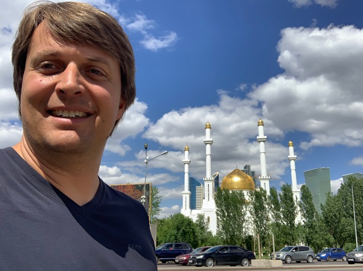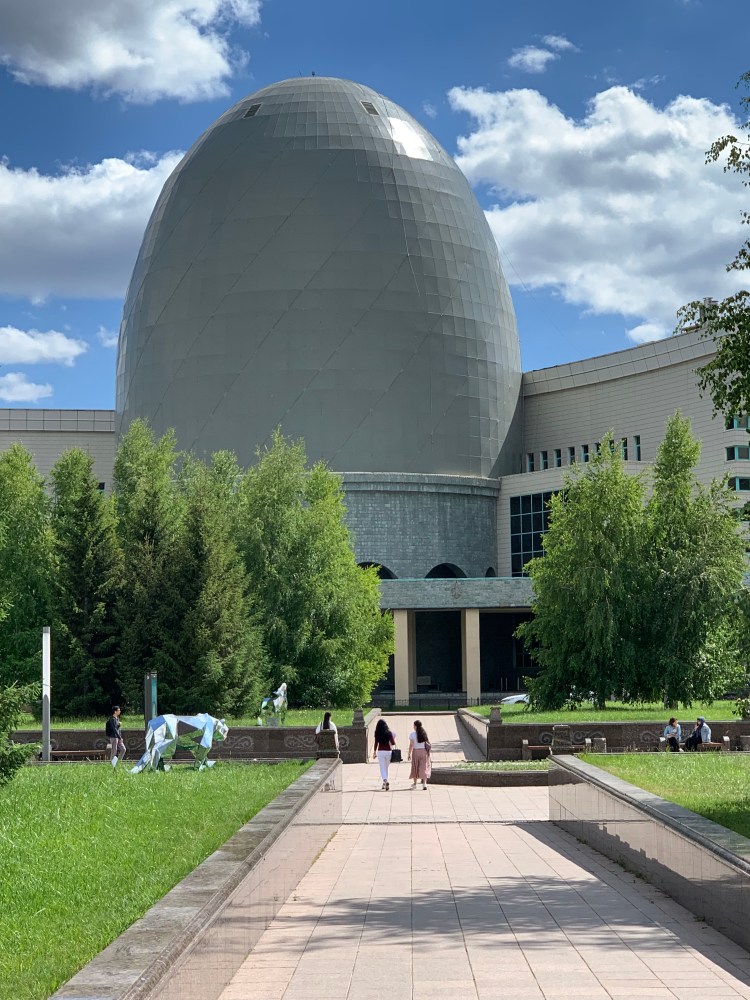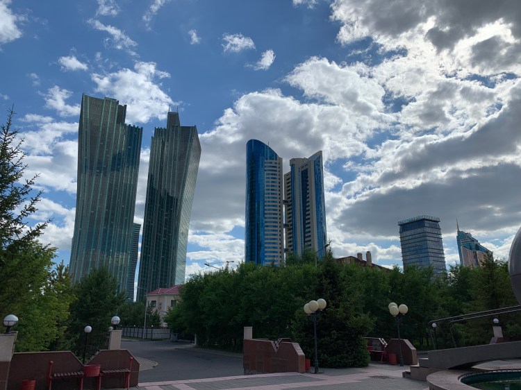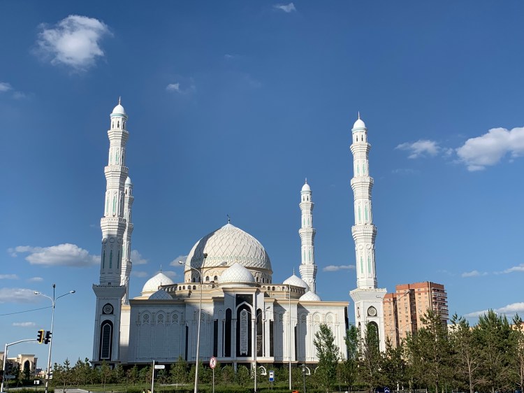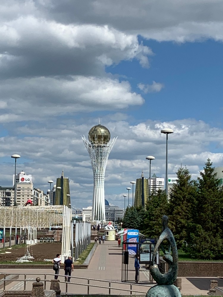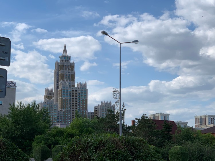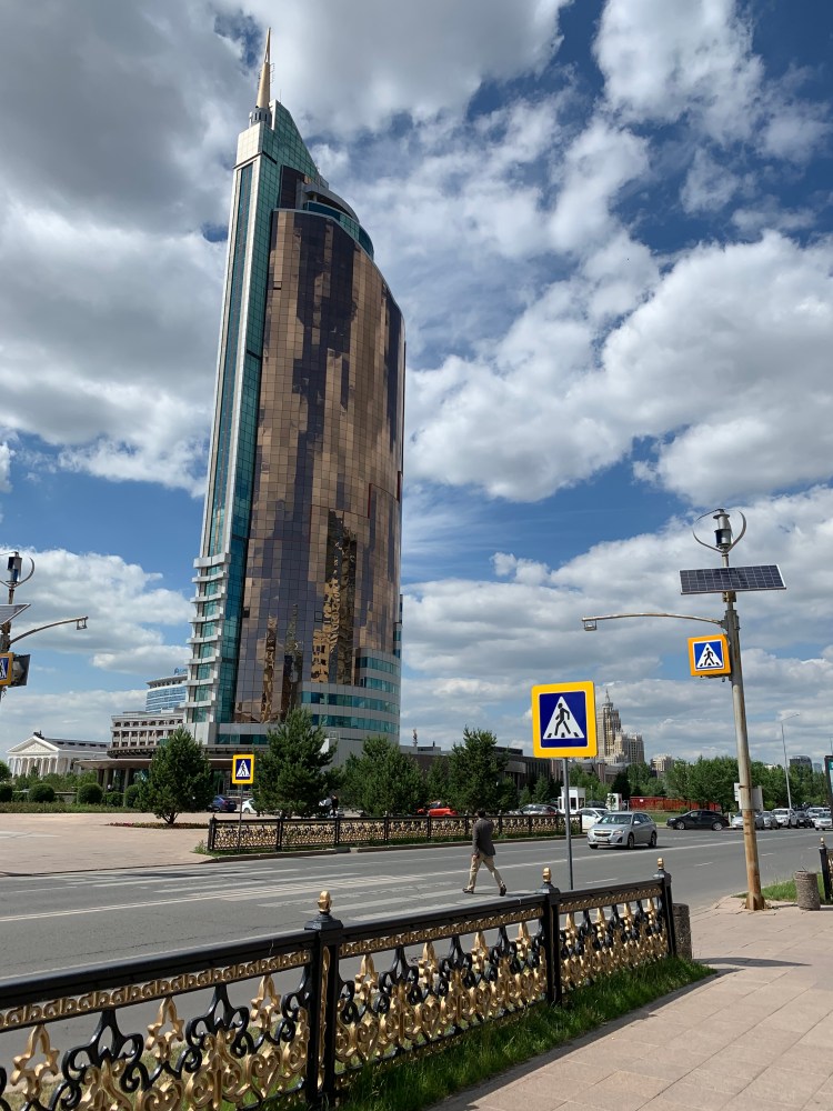 On the way back to the hotel I walked for some hours incl. lunch break through this brand new capital city in the steppe. It was called Astana until it recently got renamed after the former president, Nursultan. By an unanimous vote in parliament, by the way. A former Russian outpost, boosted a bit by the Soviets in the 1970’s, the city as it appears today got built since the late 1990’s after it was designed as the capital of the newly independent Kazakhstan. This meant most of what I saw was max 20 years old. Cranes are everywhere, shiny new skyscrapers and residential buildings the norm. There is little Paris, little Holland, little New York, little Stalin Moscow. At night, many buildings are covered in a light show, like the Empire State I could see every night from my living room window in my former hometown.