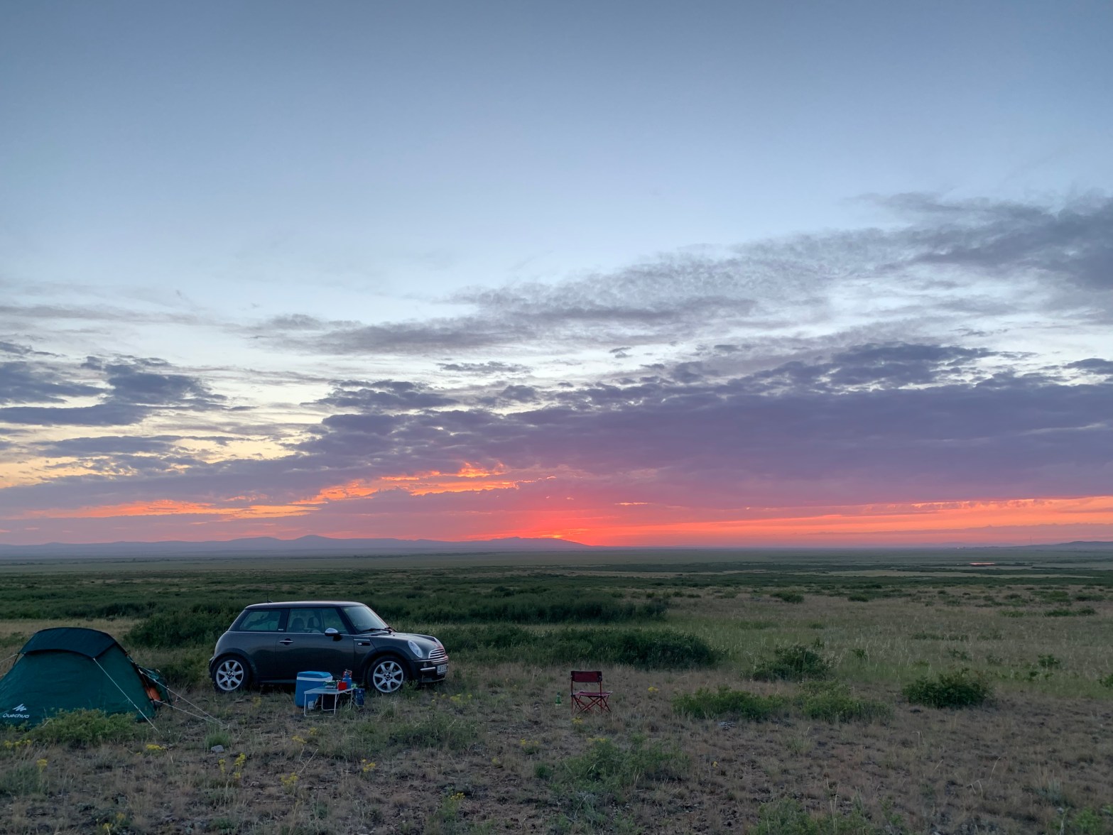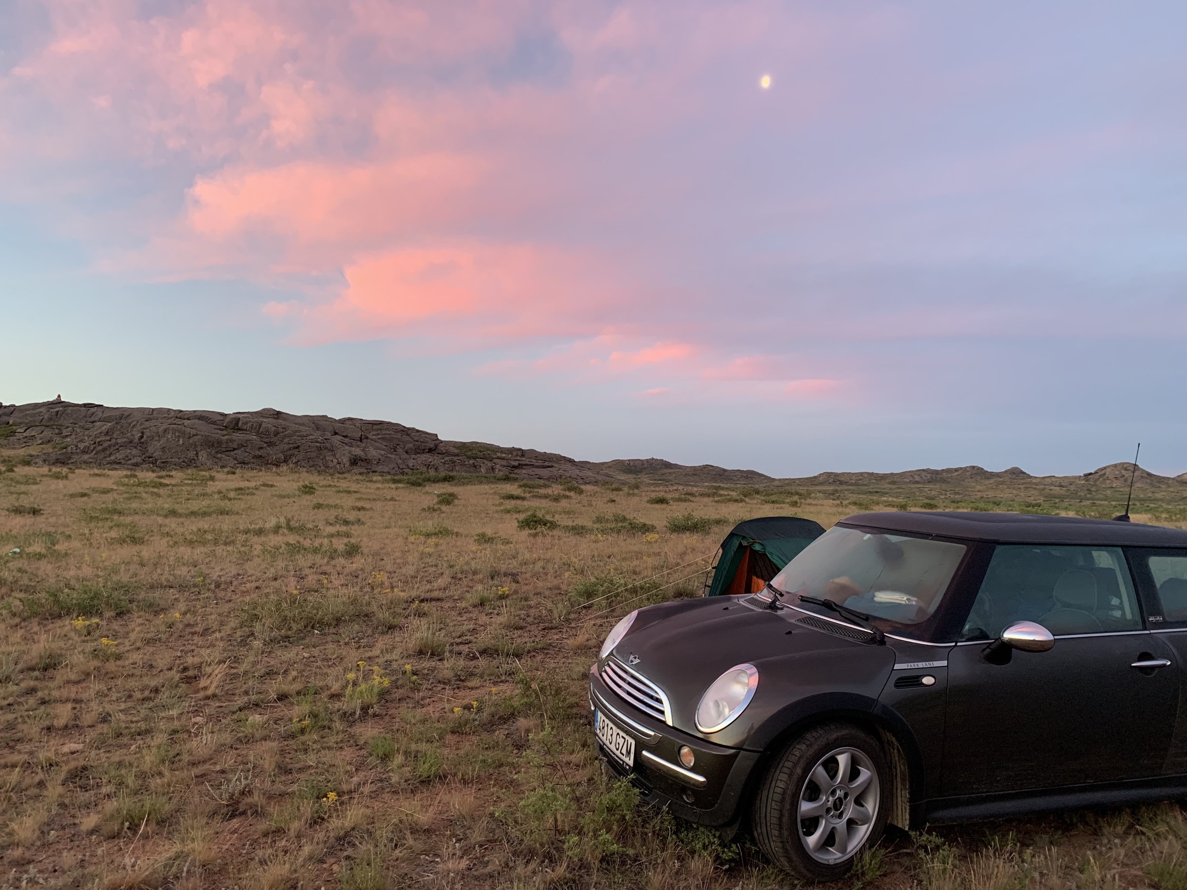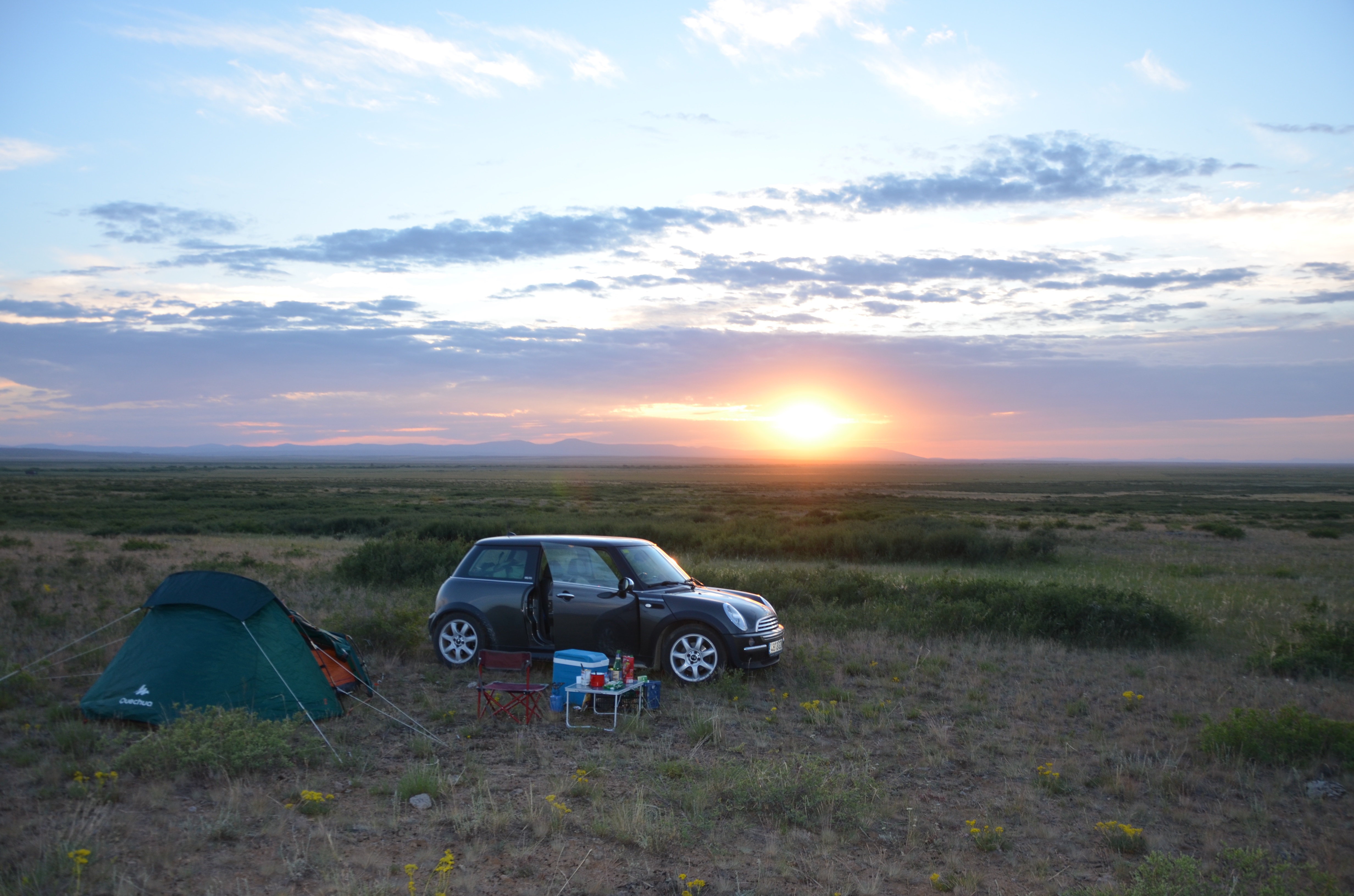 Between the two days I camped for the first time in the wild. I left the road at the end of the first day at about 19.30, drove five minutes over some rare hills, and found a spot that was not too windy, had a soft and flat ground to sleep on. And an amazing view over a plain, with the sun going down slowly over a mountain range far away. A cool Russian beer on my tiny camping chair watching the sunset made me make peace with the rough roads of the day. My food repertoire from Spain that I had in the car brought a piece from home to this remote site. I slept OK, bot for seven hours. And in the first light of the day woke up to make coffee, do yoga in the steppe, watching the sun rise between a down dog and a cat-camel. During my months of learning yoga in New York I had always dreamt of doing this on my own, in some faraway place. Here it was, magic. Namaste!
