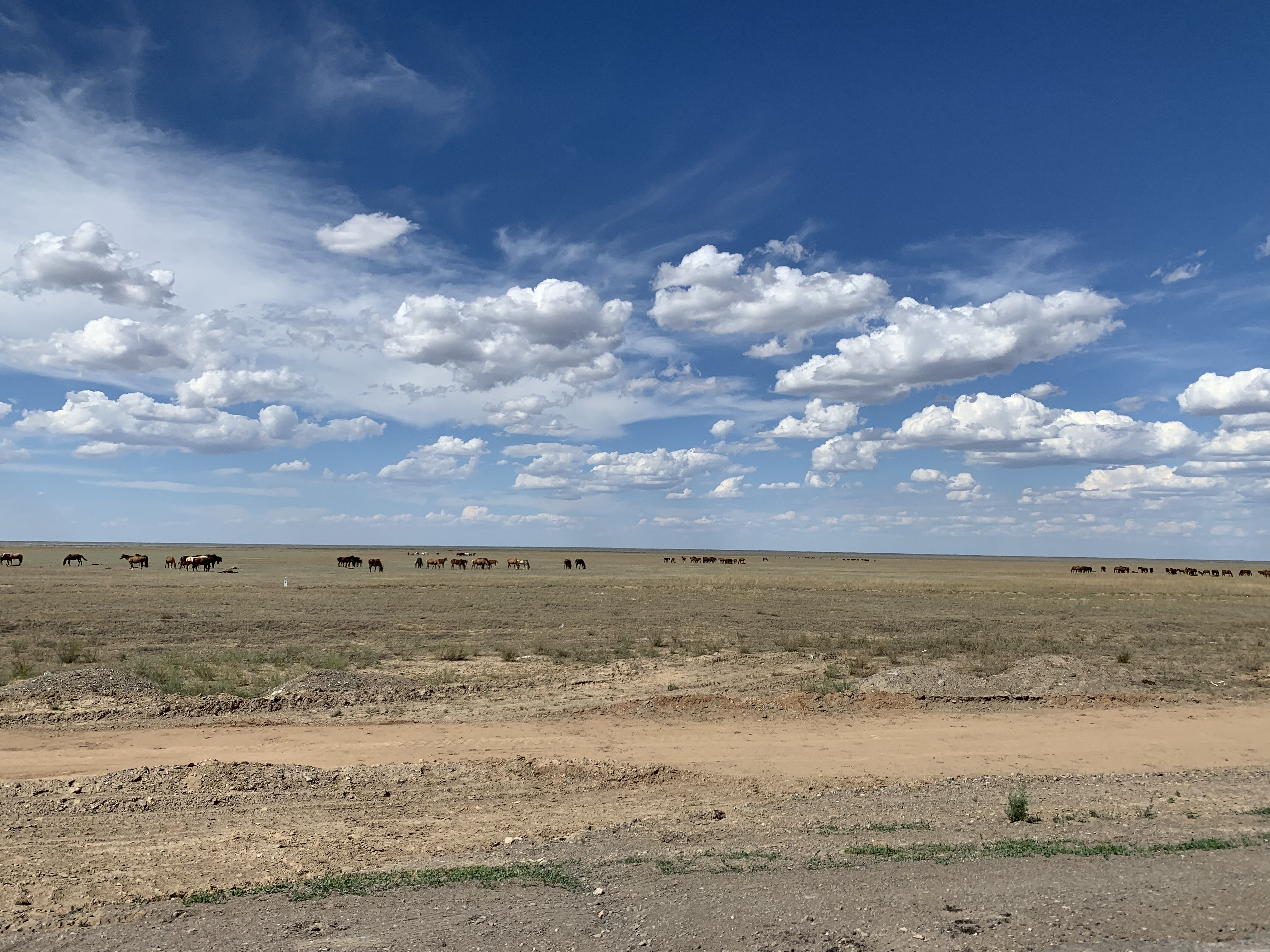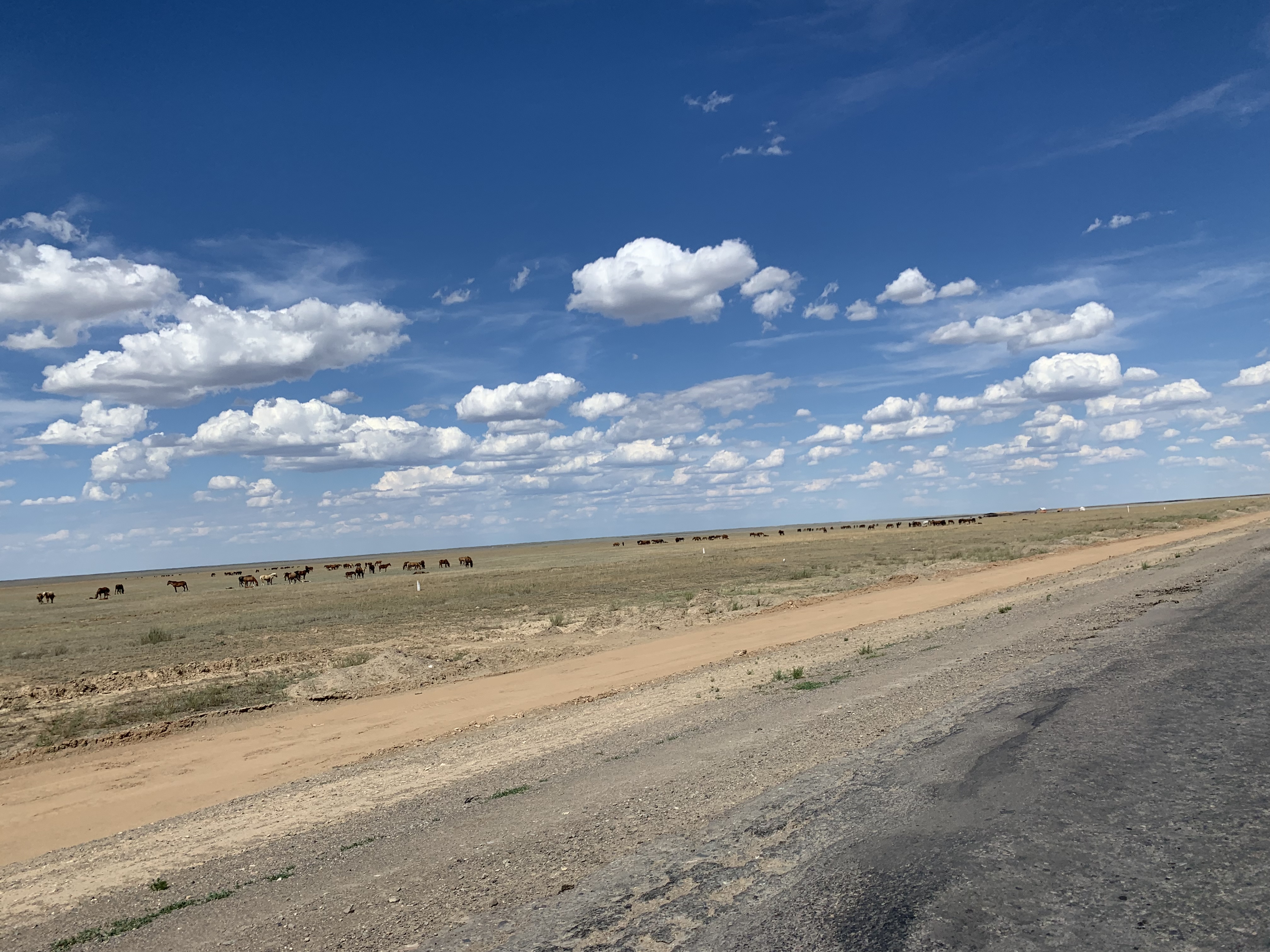 And then there is the new life. Hordes of horses run around the steppe, a lot of foals among them. As I drove by it was beautiful to see them enjoy the freedom out here, grazing and running. Sometimes they crossed the road, and everybody had to stop. The mothers guard the young ones avidly. Same goes for the cows, although they’re less beautiful and have a tendency to wait on the side of the road until a car comes close, then cross, very calmly and slowly, to make sure everybody has to stop and admire them, as they leave their presents on the tar. A big Toyota jeep tried to scare them away honking and getting very close. The cow was not impressed, didn’t even look at the vehicle and proceeded slowly. “You hit me, I win.”