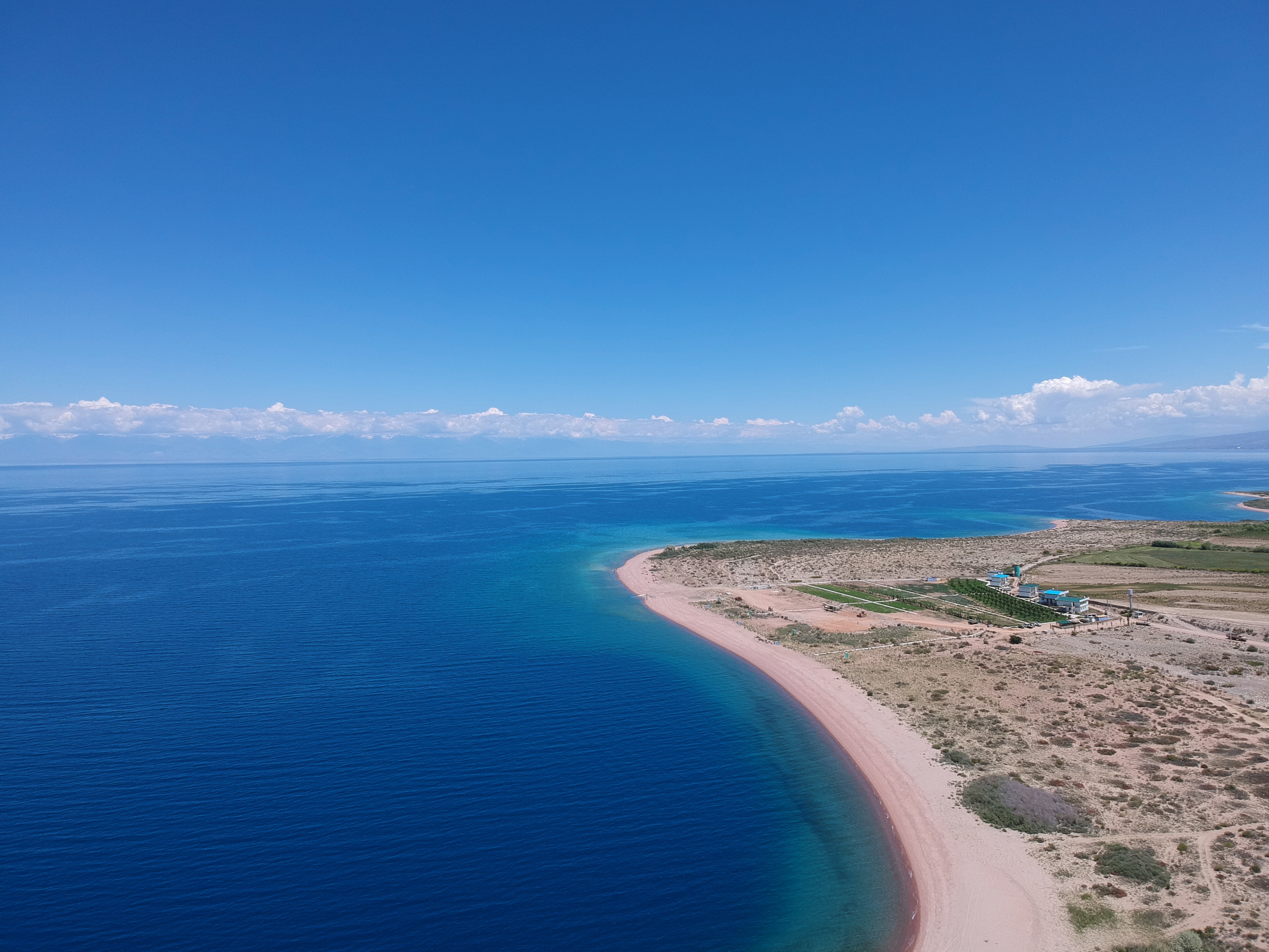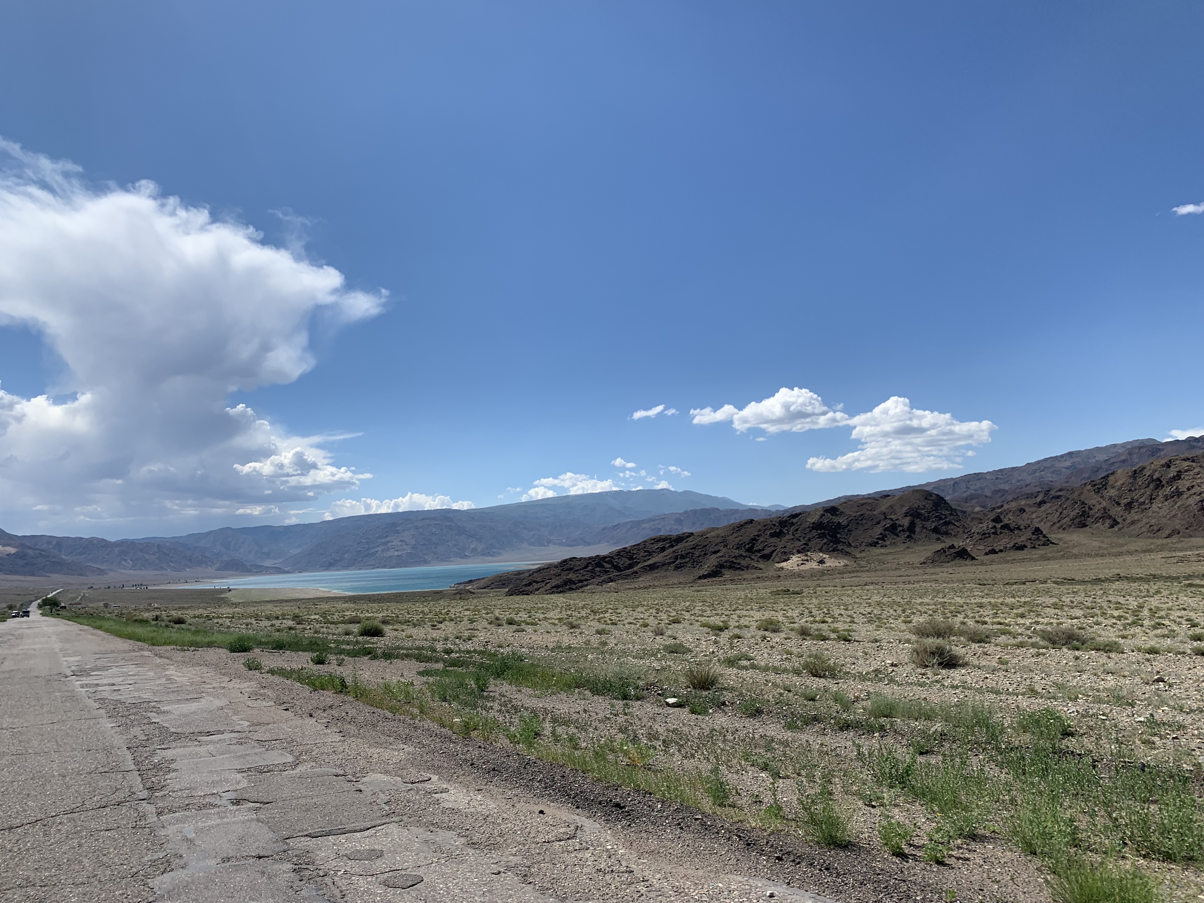 That said, leaving Karakol in the early morning, I had to fuel up, and to do that first I had to get cash, as in Kirgizstan credit card payment was not that omnipresent like in all countries previously crossed. Also, I stopped at a police station a few villages later to check on the security situation, and if camping in the mountains was safe. The Google translate conversation with the most senior officer available told me that it would be better to stay close to other people in more remote areas further up. From there, several hours of a lovely drive along the deep blue and turquoise Issyk Kul lake came next. There were many spots that I felt like I was driving around a Greek island, with the heat, the yellow sand and green trees and blue water on the side. Only the snow covered mountains on the other side of the lake reminded me of where I really was. People were sunbathing on the shores of the lake, families taking their children for a bath. I did a lunch stop in a small forest on the lake, and did some drone flying tests, at some point almost losing the drone.