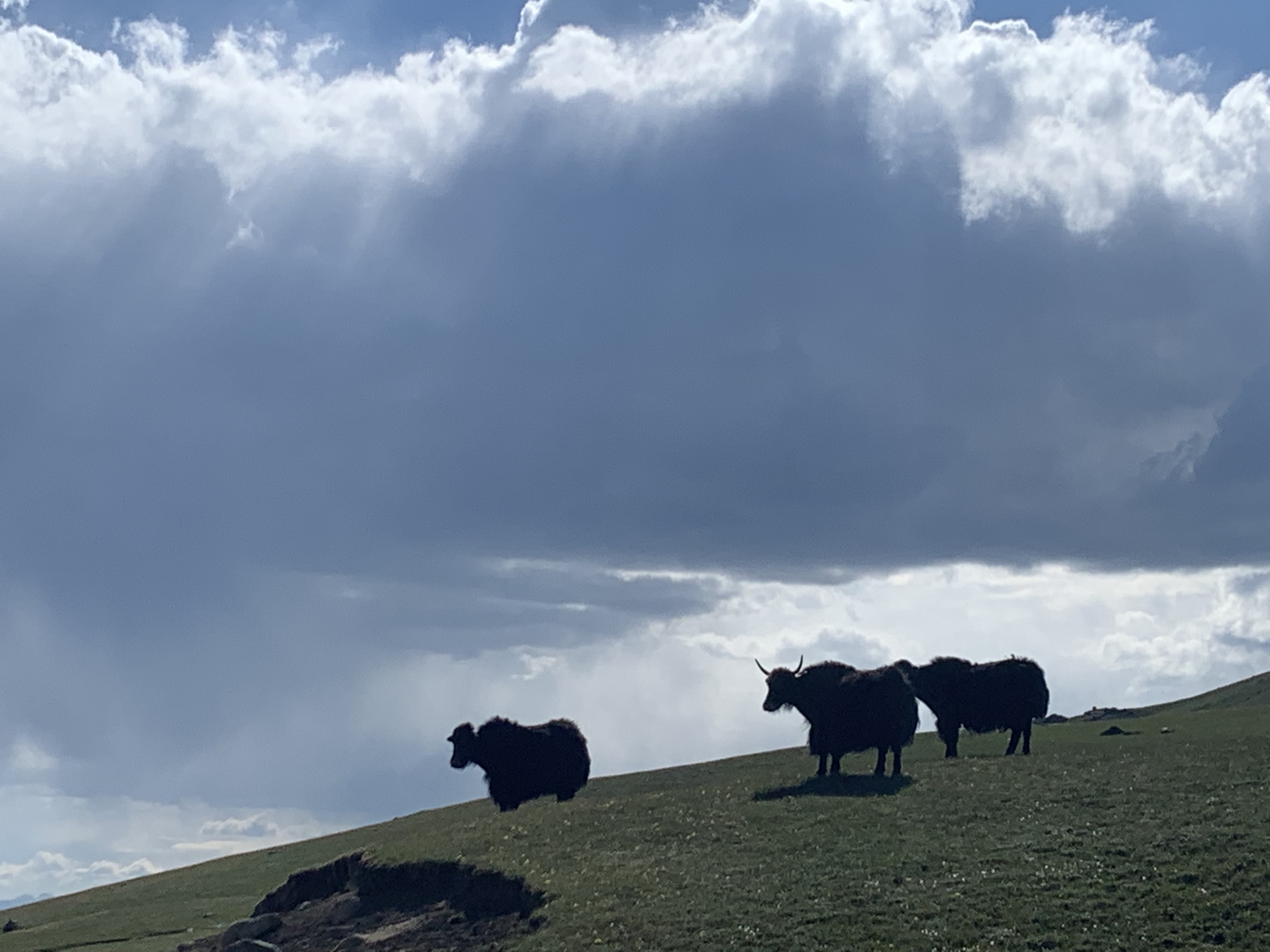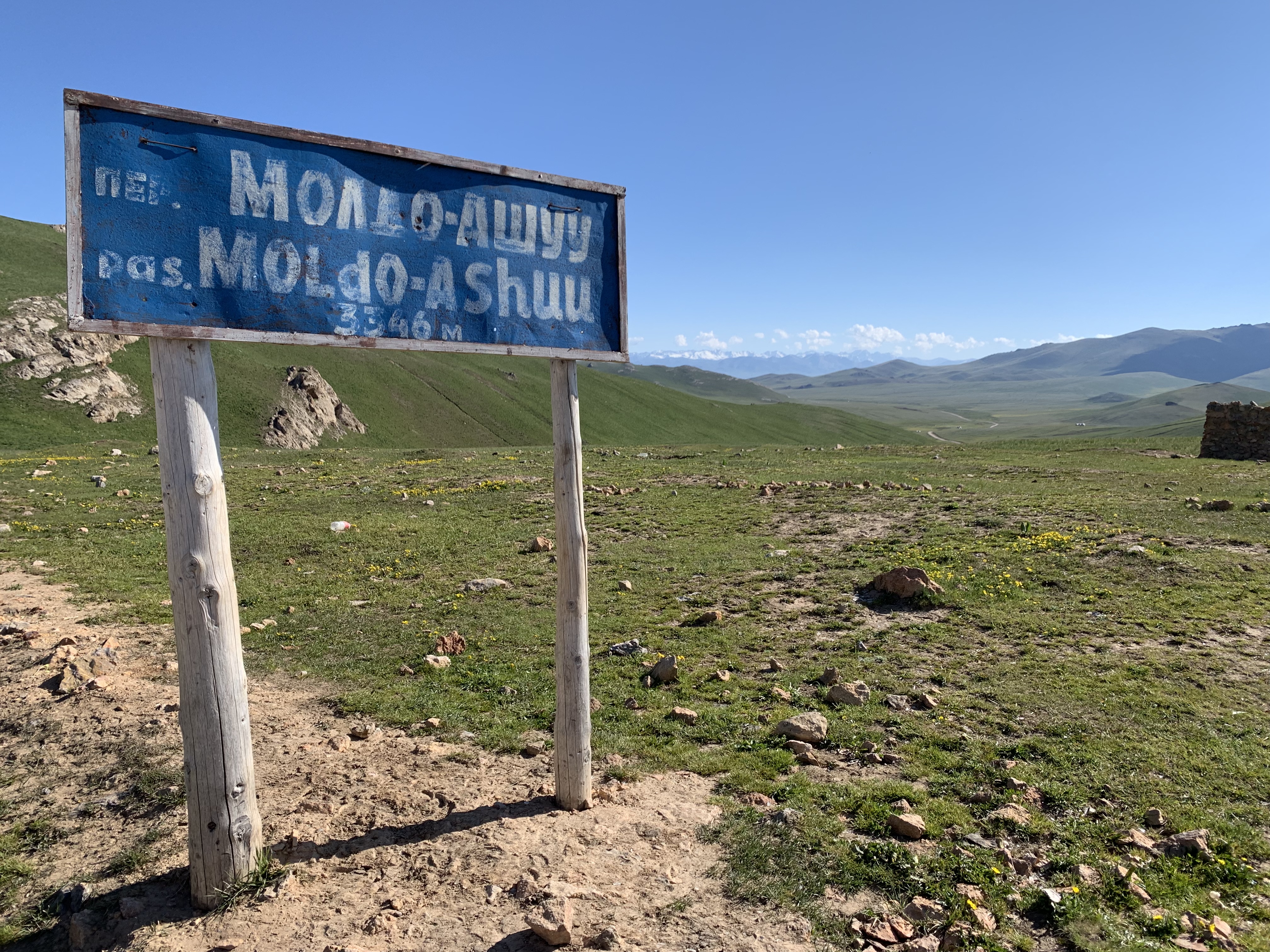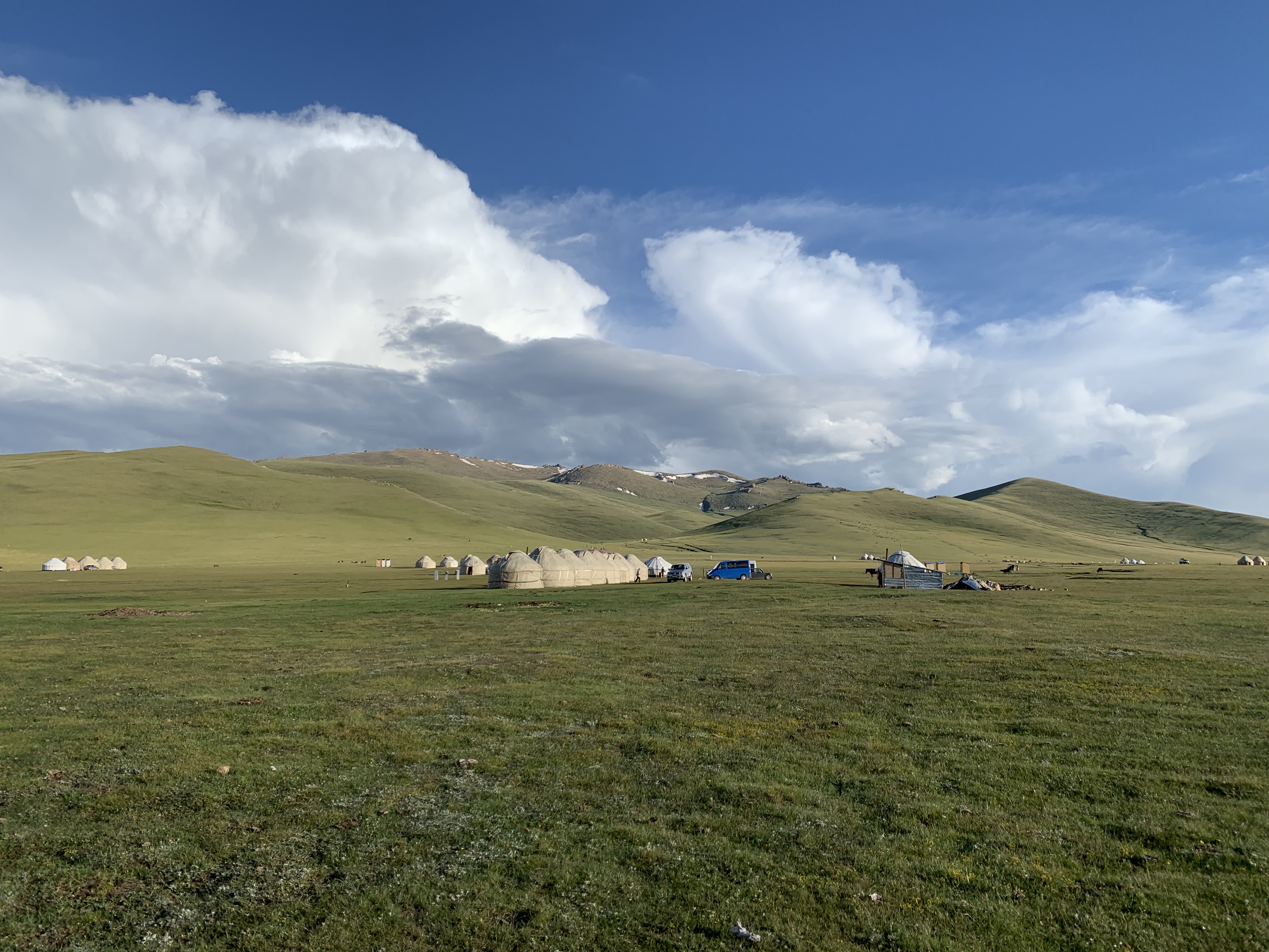 Towards the western end of the lake the road lead into the mountains, along a reservoir that was low on water at this time. Memories from the last time I drove long here came up, I recognized a lot of spots along the road. About an hour an a half into the mountains on an impeccable stretch of road, an untarred track lead towards the Song Kul lake, where in 2013 I had witnessed a spectacular view of a “fight” between good and bad weather at sundown over the lake. I remembered the road would not be easy, and it wasn’t. A gravel track with lots of stones and potholes lead though a valley, and at the end a mud road serpentine got me up to 3.400m of altitude over a pass with patches of snow. First groups of yaks grazed along few cows and lots of horses. There were no foreign cars, and also no foreign tourists it seemed. After fighting up to the pass mostly in first gear, crossing a few water flows, mud puddles and plenty of rocks, an hour of bumpy and rocky road around the northern shore of the lake followed. There were yurts of the local shepherds every few hills, and yurt “hotels”. As the day was getting to an end I thought about pitching my tent with some shepherds or if to stay at a yurt camp. Then the road divided, one side leading towards another pass I had to cross the next day, and the other one along the lake – unpassable for the Mini, as a river had swept away the track and too many big rocks blocked the passage. Time to rest, and the choice went for a yurt camp nearby. As I drove over the grass towards the camp, I spotted three Enduro bikes and some European faces between the yurts. 1.500 Som (20 EUR) for the hight incl. dinner and breakfast, and a tiny yurt all for myself seemed a very good deal. As I parked the Mini several people asked me where I came from, and when my answer was “Barcelona” they seemed impressed, with that tiny car. I went to wash the dust of the day off in the lake, and switched shorts-tshirt-light shoes for long warm pants-layers of sweaters and all down jackets I found-my only remaining pair of boots. At dinner I was invited to a table of Italians from Turin, 2 couples in their 70s with their Russian tour guide. I was impressed that at their age they would take a week off to come out here. I also met one of the bikers, from Austria, that gave me an update on several roads that lay ahead of me in the coming weeks and he had jst crossed. Unfortunately bad news for a lot of places.