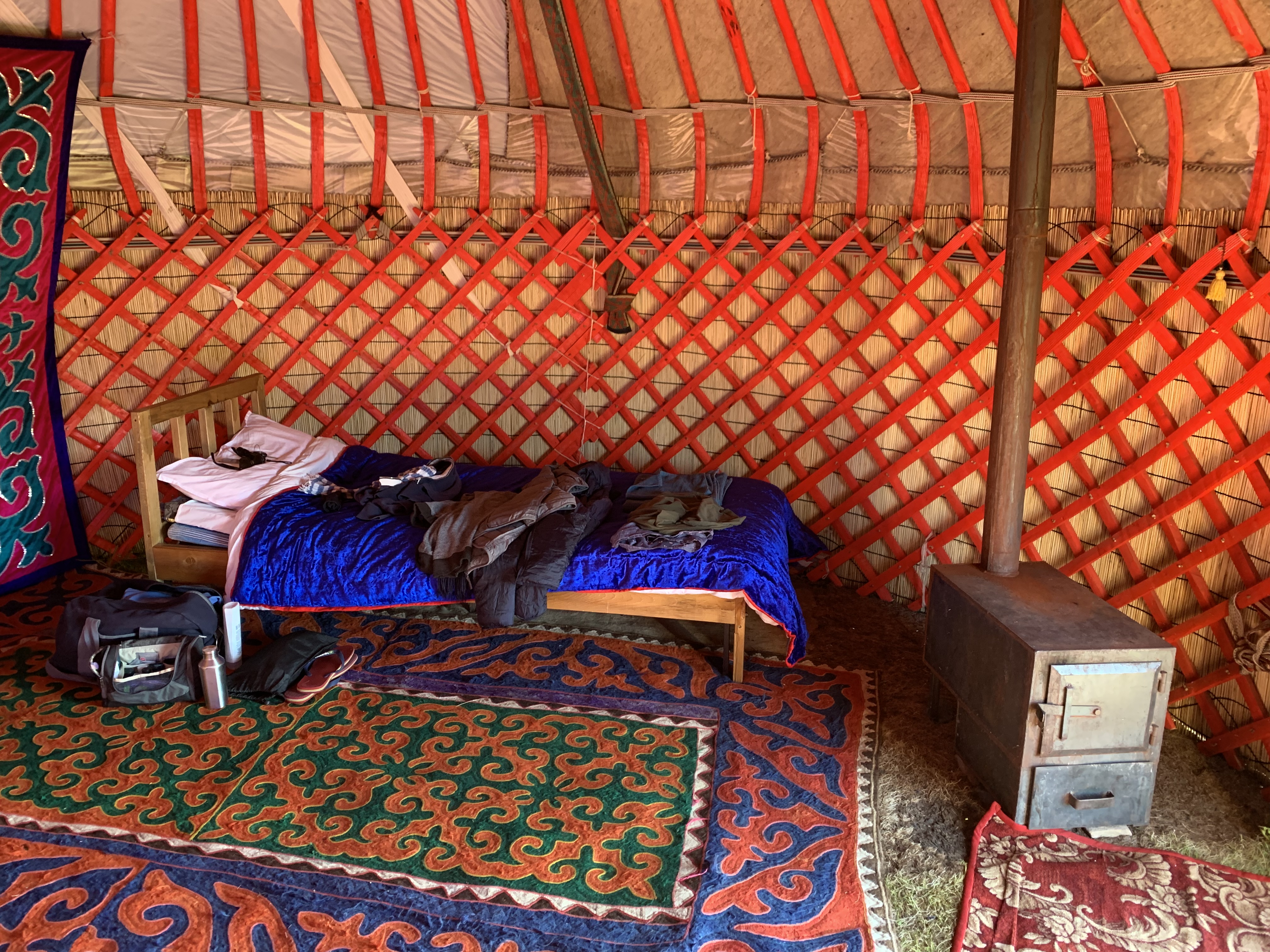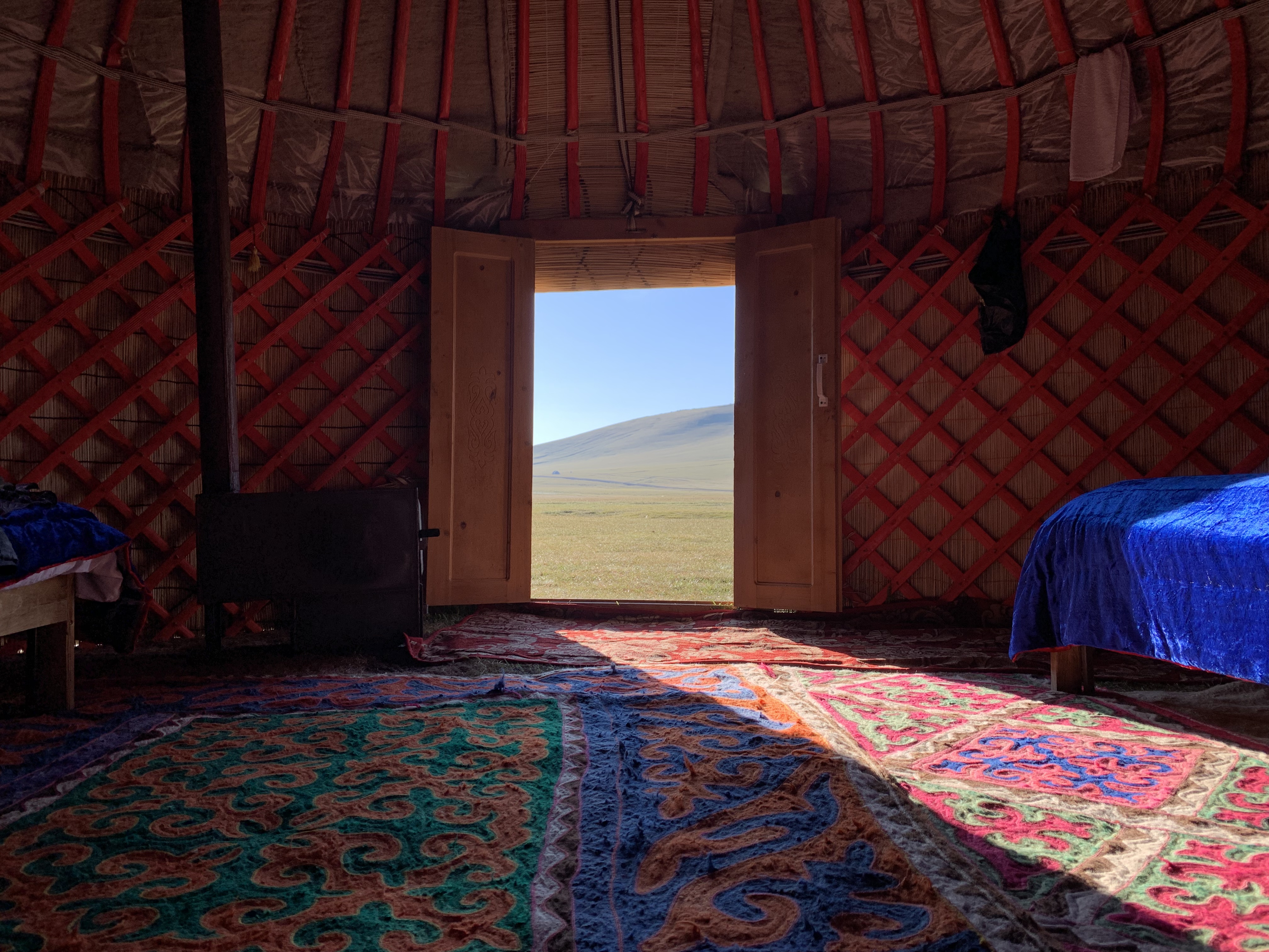 The next morning I woke up shortly after sunrise at 5.30. The night had started well in a warm yurt with the coal oven on, and ended in a cold morning wake up. I went to wash myself in the lake, and my bare feet froze as I ran the few hundred meters on the ice cold grass towards the lake, that was not that cold, and back to the yurt. Nobody was up, and I made coffee on the roof of the Mini. I opened the yurt’s door to let the sunshine in and did a session of yoga, looking over the valley, drinking coffee in between vinyasas. A great start of the day. Breakfast was simple but filling to start the day, and after saying farewell to the people I had met I took off at 7.30. Half an hour later I crossed a pass at 3.200m to fly the drone again, and then spent about two hours downhill, in first gear, testing my brakes, through a beautiful alpine landscape I remembered from 2013. The road was horrible, and once I reached the main road in the valley, the Mini was thoroughly covered in dust, and also inside there was a thin layer of it everywhere. From that point there were three ways out. The first I tried was over the mountain range on the other side of the road. It should have lead me to an old caravanserail in the next valley, on the road to the Chinese border that would have been very good. According to Google maps there was a “road” to get over the mountains. That “road” got worse and worse, and at some points the two thin tracks over a field stopped abruptly in front of a gorge. No more road. I had to turn around. On my way back I met a shepherd on a bike that led a few horses and sheep somewhere. He told me I had to take another road on the next plateau, across a river. I gave him a bottle of water when he asked for it and we shook hands. I tried to find the river crossing, but at some point a canal had broken in an area where I was driving on sand tracks. The water had flooded the road, converting the ground into mud. I almost got stuck in it with the Mini, that now was covered with mud on the entire right side, and had to drive over a 10m field of big rocks, very very slowly. I was surprised it didn’t get hit a single time. The nightmare of a flat tyre around here followed me on every meter. But we survived. 1,5h later I was at the same main road I had left in the morning, a total of 3h lost. I tried option 2, following the main road westwards towards Jalal-Abad. After a few km on bad roads that converted into gravel track and potholes I gave up. Jalal-Abad was too far away to reach it on these roads. The last chance was to drive almost back to Issyk Kul lake, taking an endless detour on a very bad road. It was the least worst option, and actually the only one I had. It was painful. When I finally reached the better main road about 1,5 later, my spirits were very low. I decided to stay the night in Bishkek, as there was no other option to camp outside and I didn’t feel like it. I reached Bishkek at about 20.00. The grey Soviet industrial town was so different from the city I had seen in 2013. And my hotel was pretty bad, I had booked it on the road, between potholes, overtaking trucks and avoiding the omnipresent police stops. But I just needed a shower and a bed for the night.