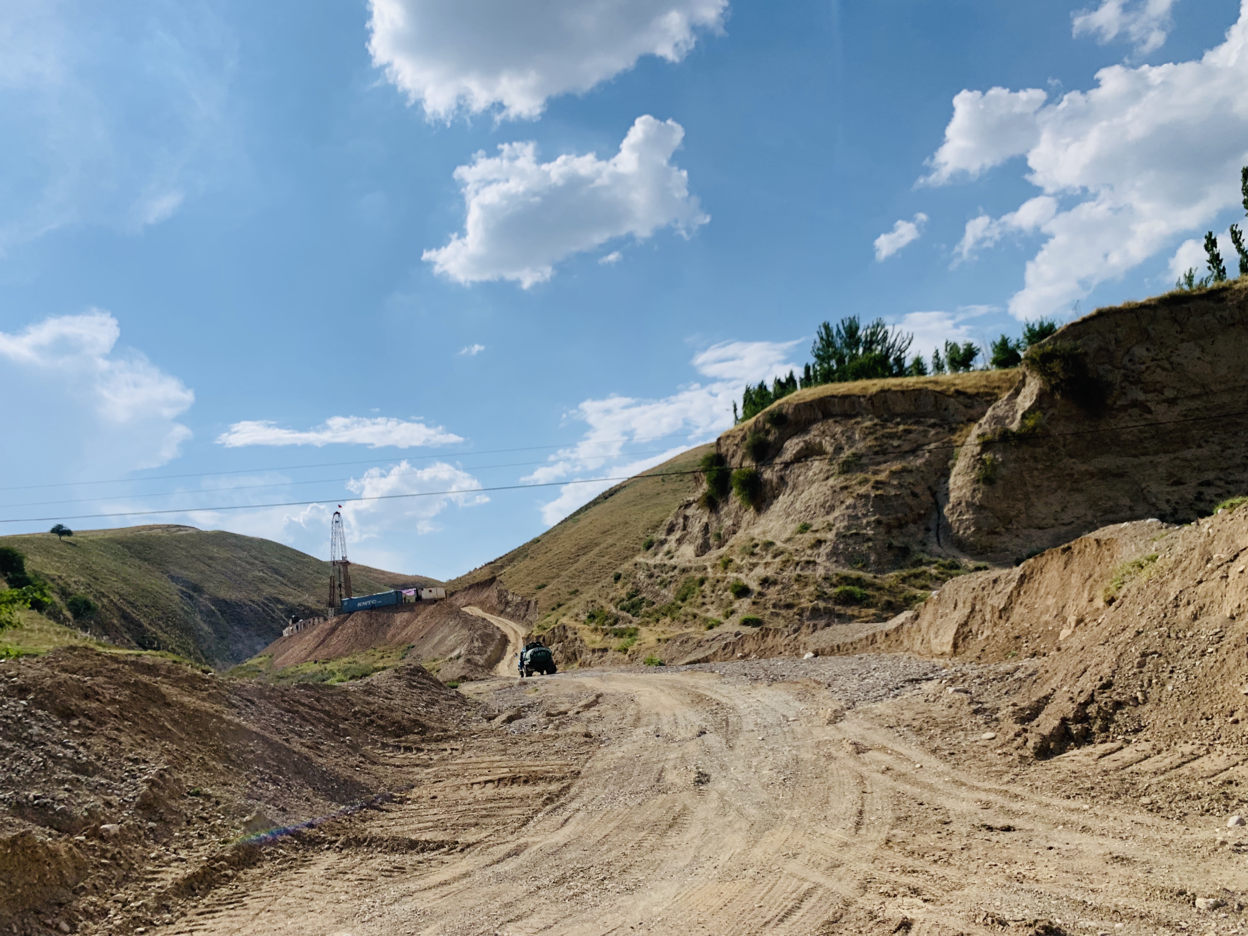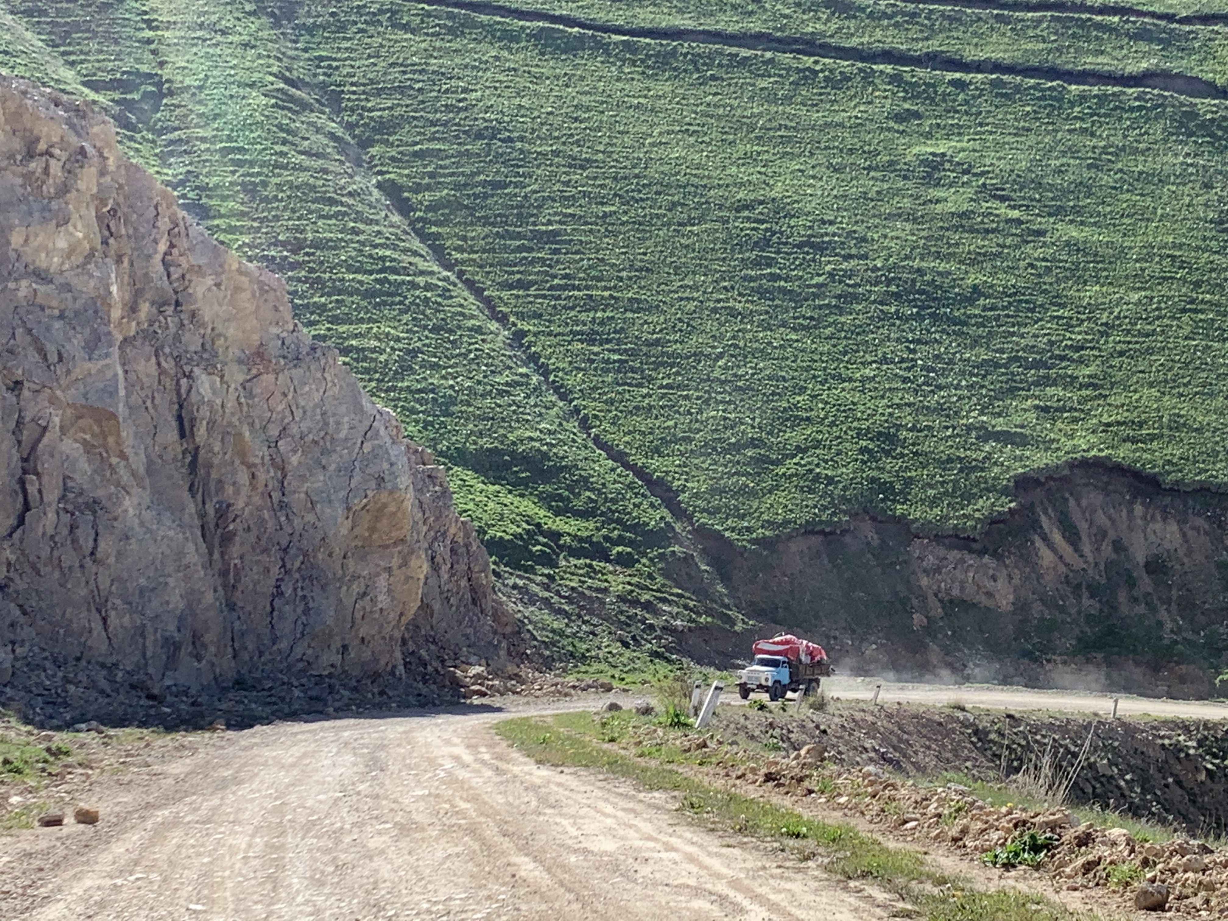 The landscape changed when I reached 700m altitude. The valley got wider, and fields gave fruits that the peasants sold along the road. Big melons, were in season apparently, and the melon trade was in full swing, the trucks loading directly from the fields. I was very tempted to buy some fresh fruit. But there was a place I wanted to see in the next valley, Malisuu, one of the 10 most polluted places on the planet. I reached the village about an hour later, and an eerie feeling overcame me as I drove into this evidently Soviet mining town, that was falling to pieces now. Every person I passed stared at me, tourism isn’t a thing around here. There was not a lot to see quite frankly, apart from crumbling industry lots and a few old oil wells. I left happy to get out of the place.