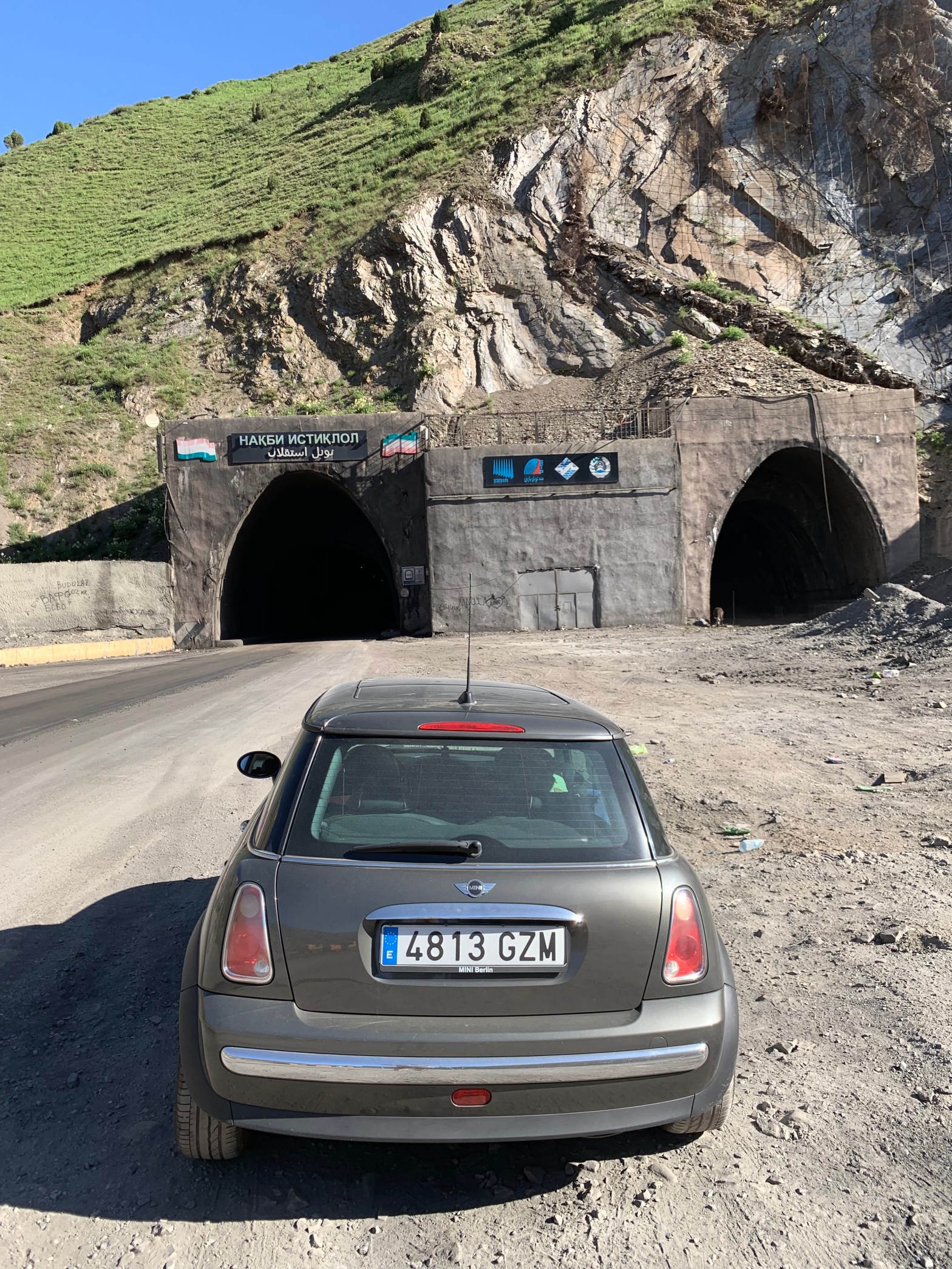 When I first saw videos of the so called “tunnel of death”, officially the Anzob tunnel, I wondered why I didn’t go see it during Eurasia2013. At the time unfortunately there was no time, as the entry into China was on a set date and I had to hold a timeline. After the past few days worrying about the Mini, and flying in parts twice from Germany, driving out of Dushanbe there was dead silence in the car. My ears would have made any spy agency listening station pale. Every little noise made me worry. But in the end it was either a pothole, or a Lada I overtook, or the truck on the side of the road – but the Mini drove fine, very smooth. With the new dampers it felt so smooth to drive over the few potholes on an almost perfect road from Tashkent to the Chanak border crossing into Tajikistan. The border was 90 minutes from the hotel, it took another 90 minutes to cross it. Somehow I wasn’t into borders today, and got grumpy with the Uzbek guards that asked me to unload the entire car. It worked, I had to only pass three bags through an Xray that nobody checked. One of the border guards sat in the driving seat and started to play with switches and the radio. “Hey, what are you doing there? Leave the car alone!” That worked too, the customs check was over. New learning: treat border police at bigger crossings bad. I applied that learning a few minutes later at the Tajik station. As I had read in a few travel blogs, the officers try to squeeze money from tourists. First try: the “sanitation basin”, a hole with water I had to drive through. They wanted 3 USD for that puddle. I refused to pay, and told them that I everybody on the internet is writing about this scam. Few minutes later they let me go without paying. Next stop: customs, 25 USD “road tax”. They spoke Russian, I only English. They told me something, I replied that I had read online about border crossings and had been in Tajikistan already, but never had I paid this so-called tax. “I’m a customs official, I tell you this is a tax you have to pay.” “Sorry, I won’t.” In the end the oldest of the officers, that had been taking my data and handed me back my documents, went outside with me, walked up and down the customs check hall, gave me a piece of paper and said “Go!”. I got into the Mini and drove away, without any payment. On the parking lot in front of the customs building several black Mercedes and BMWs were parked neatly in the shade of a tarp.