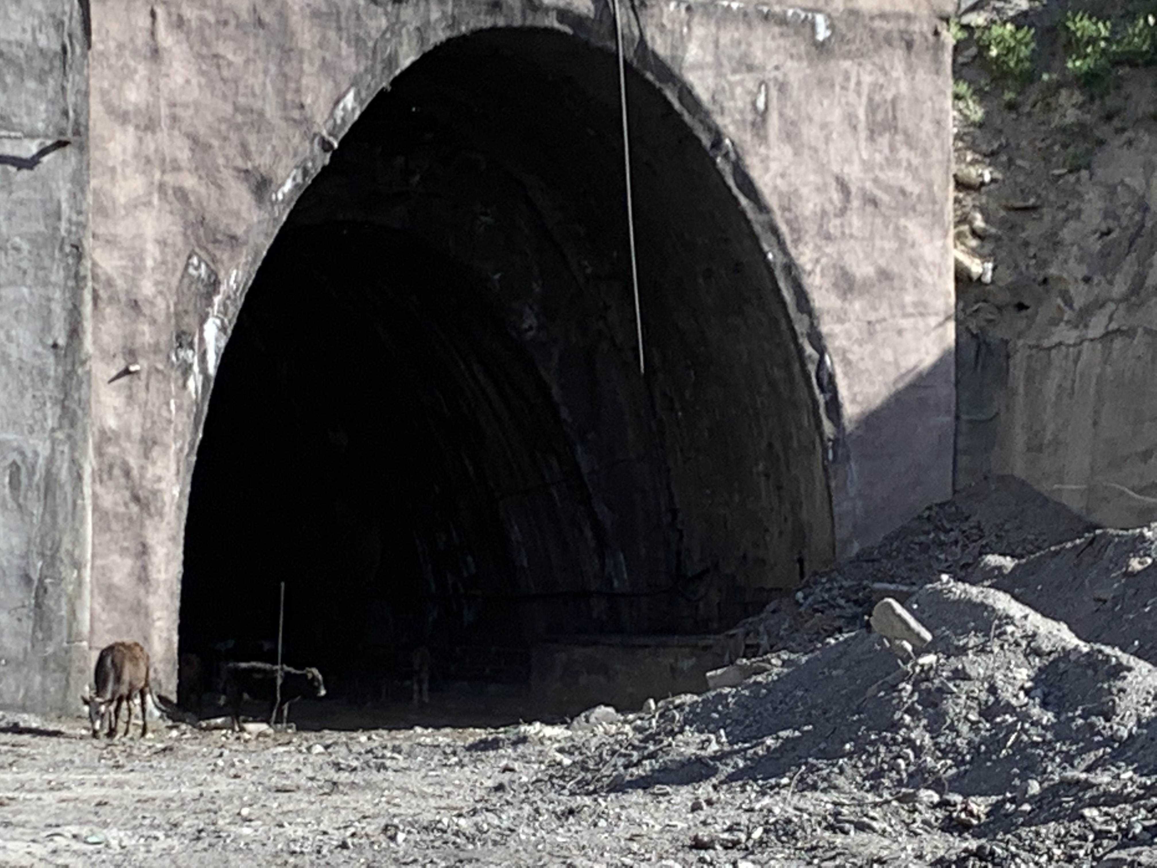 Next came the Zarafshan range, and now the serpentine roads started to become steeper, the curves narrower. The heat outside stayed brutal, and I kept the aircon on. As I overtook a jeep in a curve and started to push the gas up the hill, suddenly the temperature control maxed out and the warning light went on. Cold sweat! Aircon off, windows open, “speed” down (I was driving 50km/h only anyway. A few meters later I stopped on the left side of the road and opened the hood. Two minutes later the temperature control was back to normal, but I got nervous. Further up the mountain I reached a tunnel with no lights, no signs, but it was over fast. Was that it? Not yet. I recognized the Anzob tunnel from the two entries, of which only one was in use (the other used by cows to avoid the sunshine). I closed the windows, took out the phone to record the crossing, and turned on all lights of the Mini. The road was actually very good, paved, there were even stretches with light. A few construction workers were walking around in the dark, a car had broken down and stood in the tunnel with warning lights on. That was as bad as it got. The 5km were over very soon, and I drove out on the other side into a beautiful valley through the mountains. Nobody died, and I was a bit disappointed as I had imagined the road to be a lot rockier. Video here.