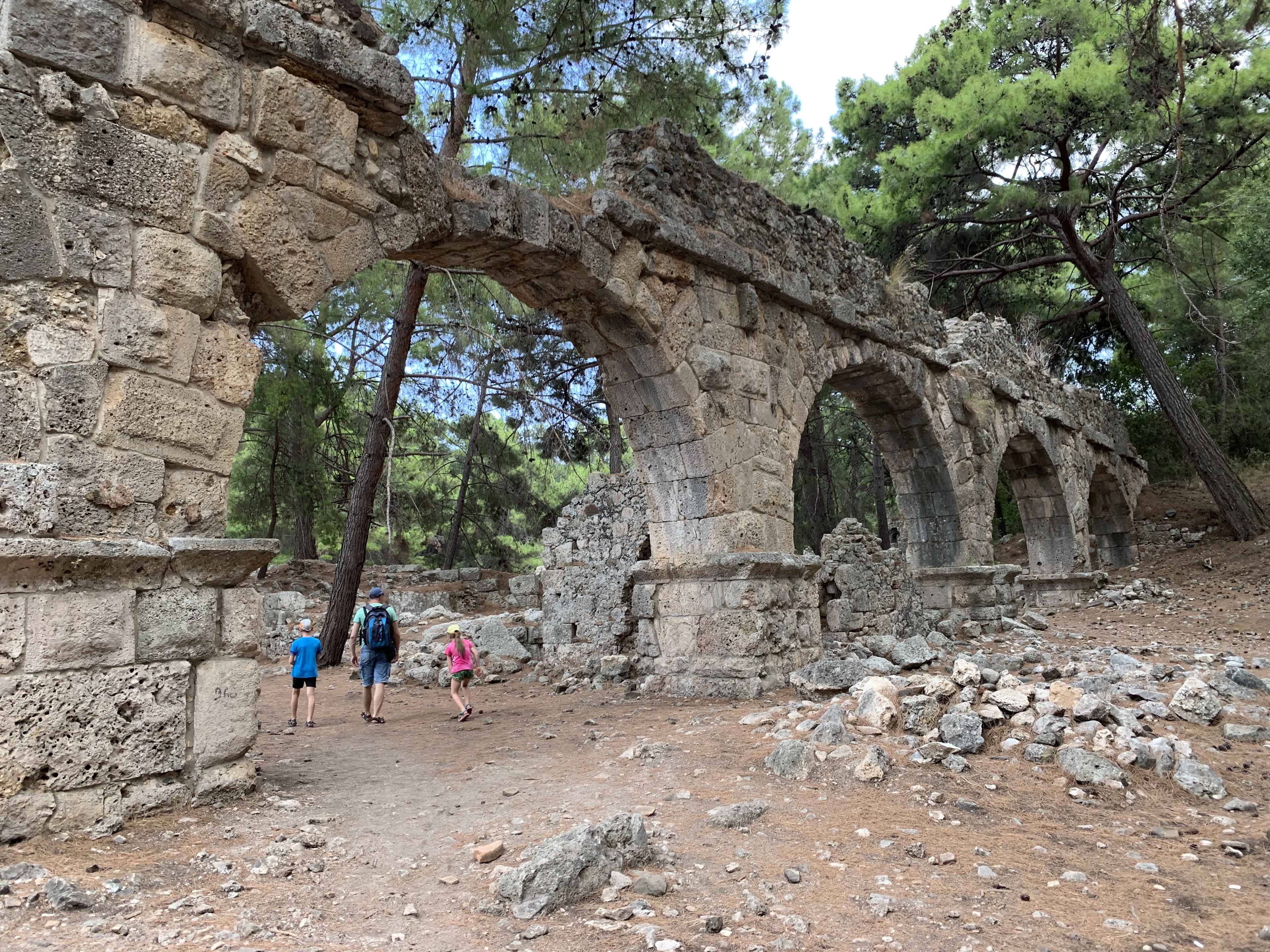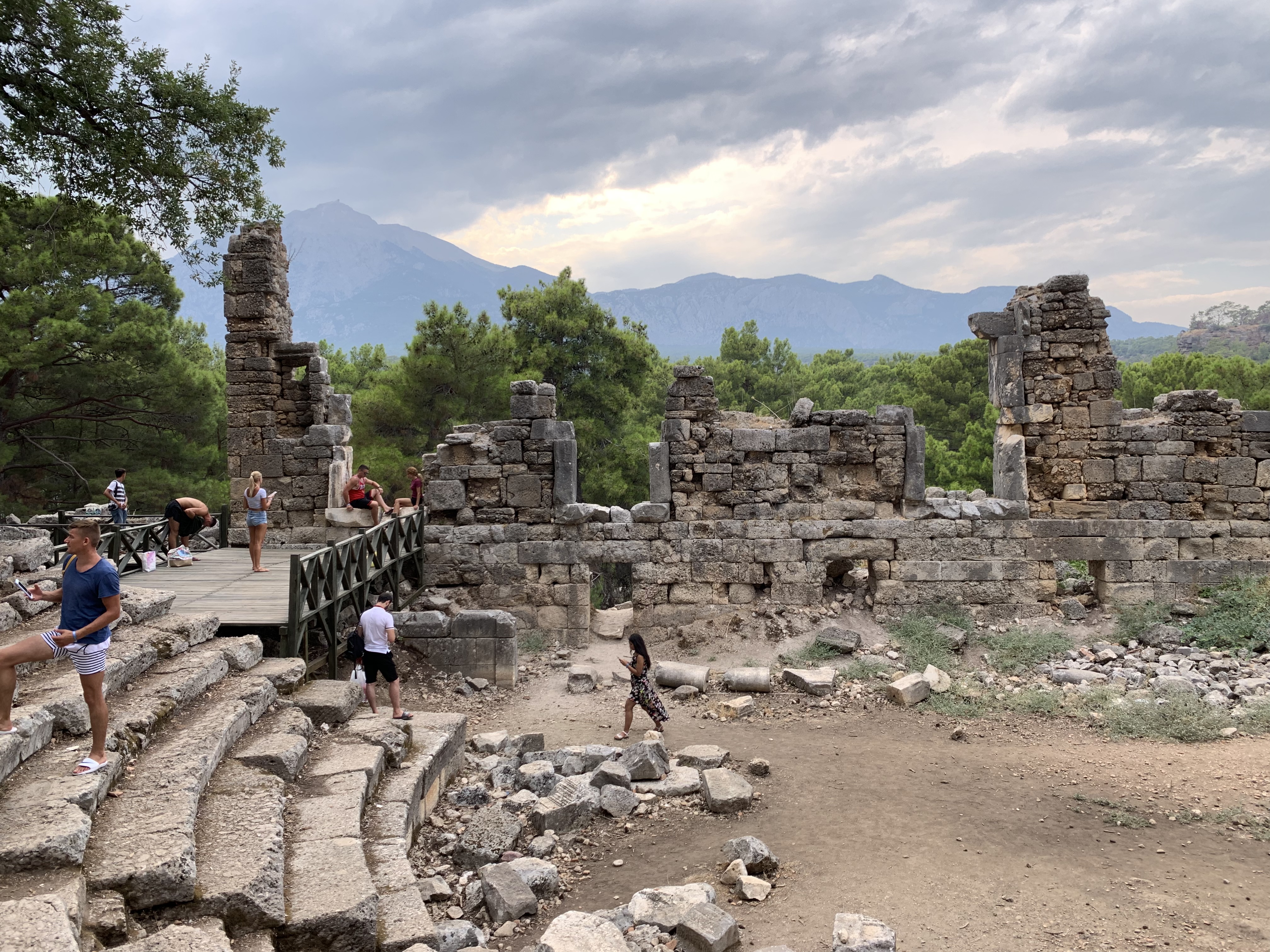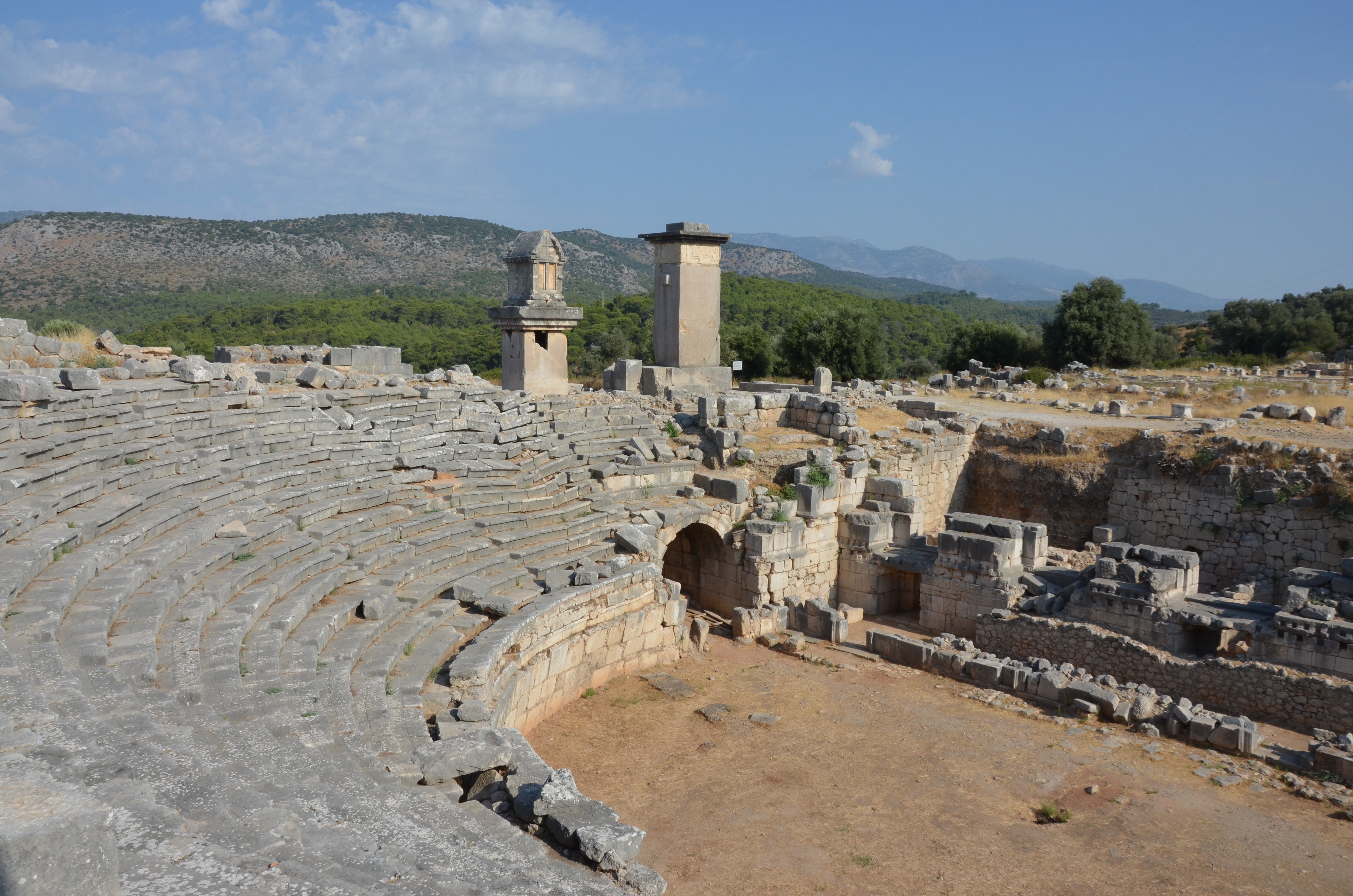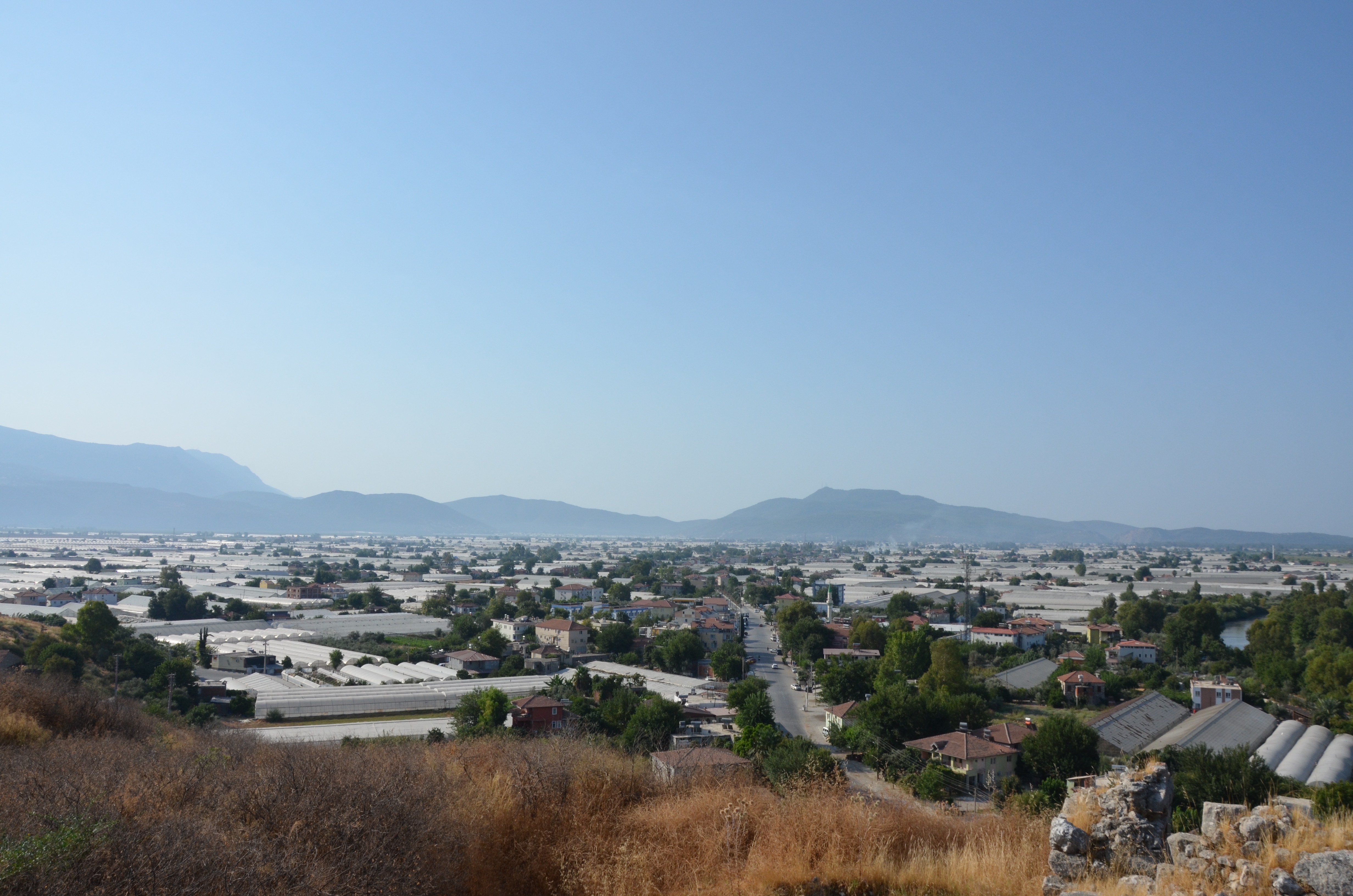 The next morning I packed and left early. In Kas not a single coffee bar or shop was open, and so I hit the curvy seaside road. The sun was not hot yet, traffic light, and for less than an hour I kept gliding very slowly along a breathtaking Mediterranean landscape, passing turquoise bays, the first yachts starting to move for their day sailing on a still tranquil sea. It was a magic moment. Reaching Xanthos, I was the only visitor in the morning. The security guard sipped on his tea with the souvenir stand owner. Strolling around the ruins I tried to imagine ancient life in this beautiful setting. Like in Phaselis, the city featured a theater that was well preserved. The endless plastic of the greenhouses in the valley nearby stood in stark contrast, modernity v antiquity. It would be a common sight in Turkey, that is littered with ancient ruins, but also with massive agriculture, and a lot of trash everywhere on the roadsides.