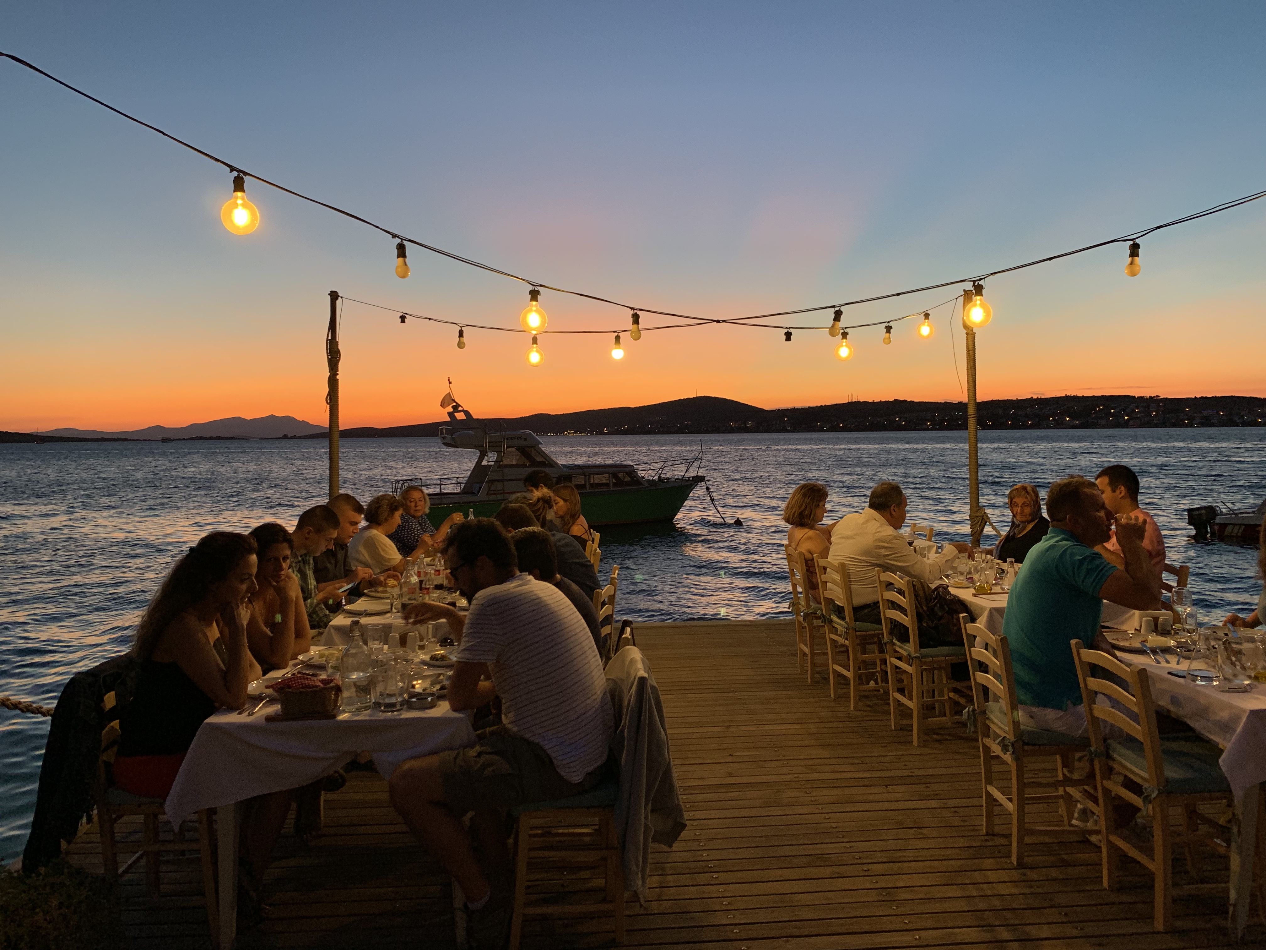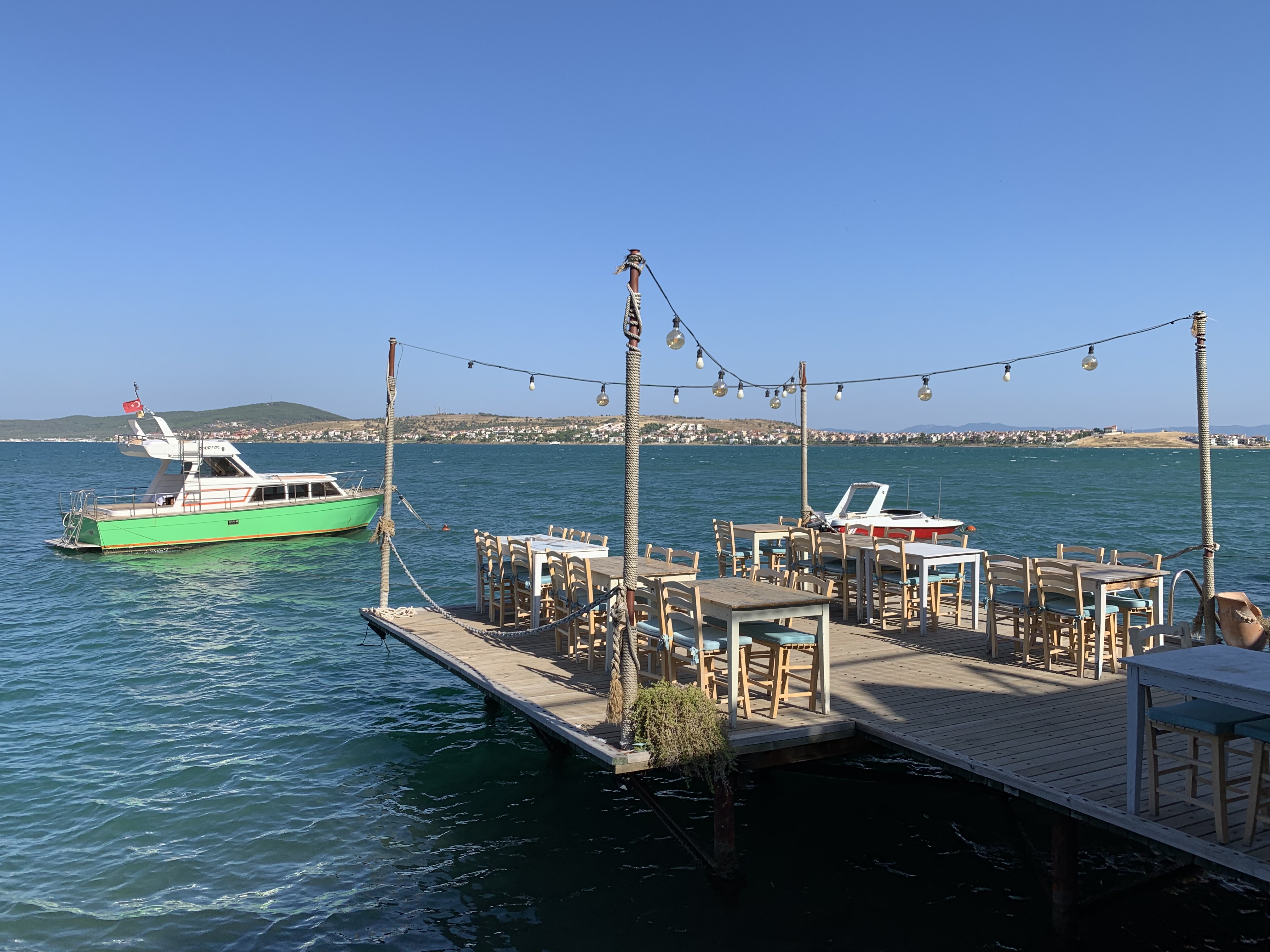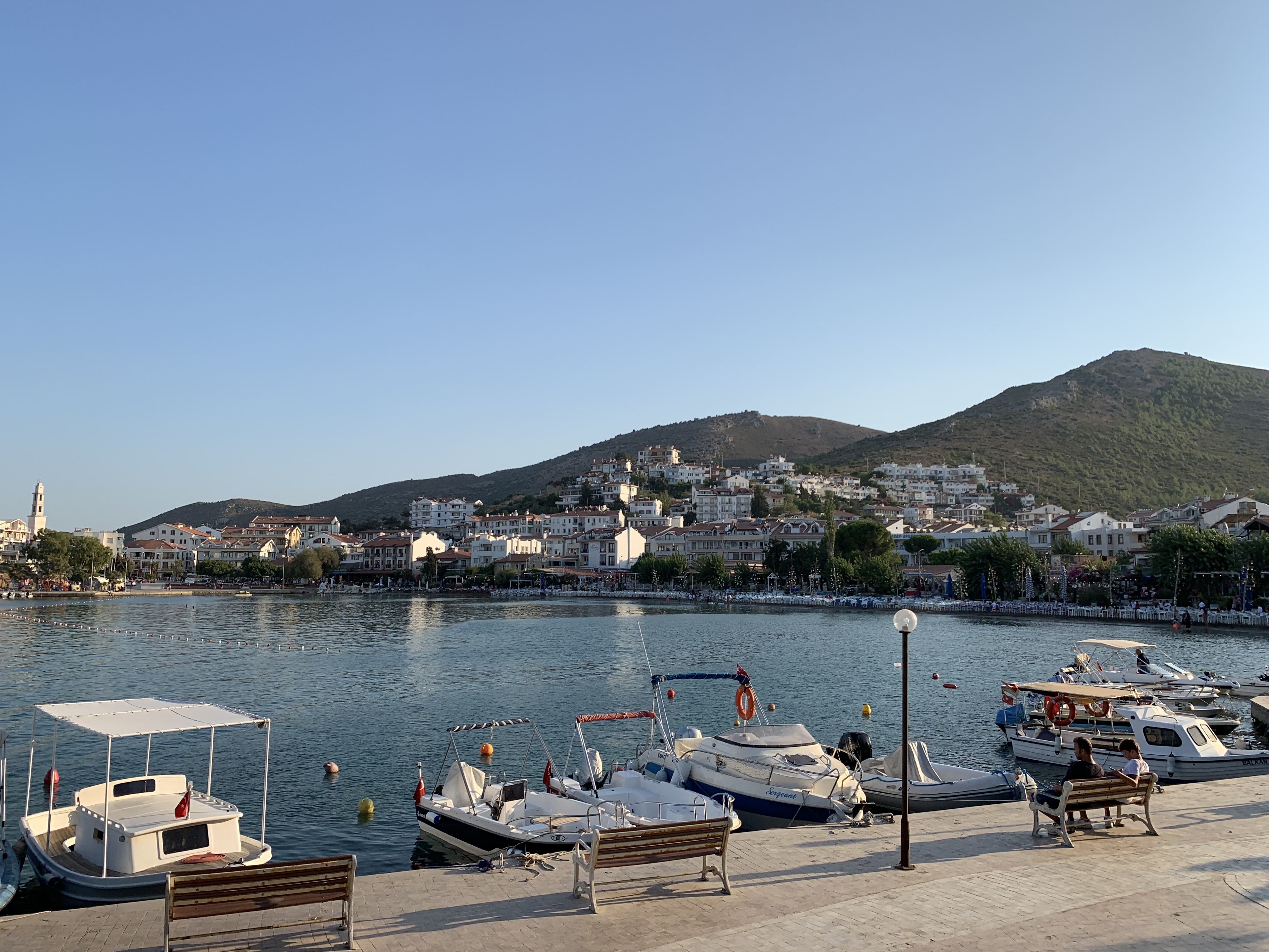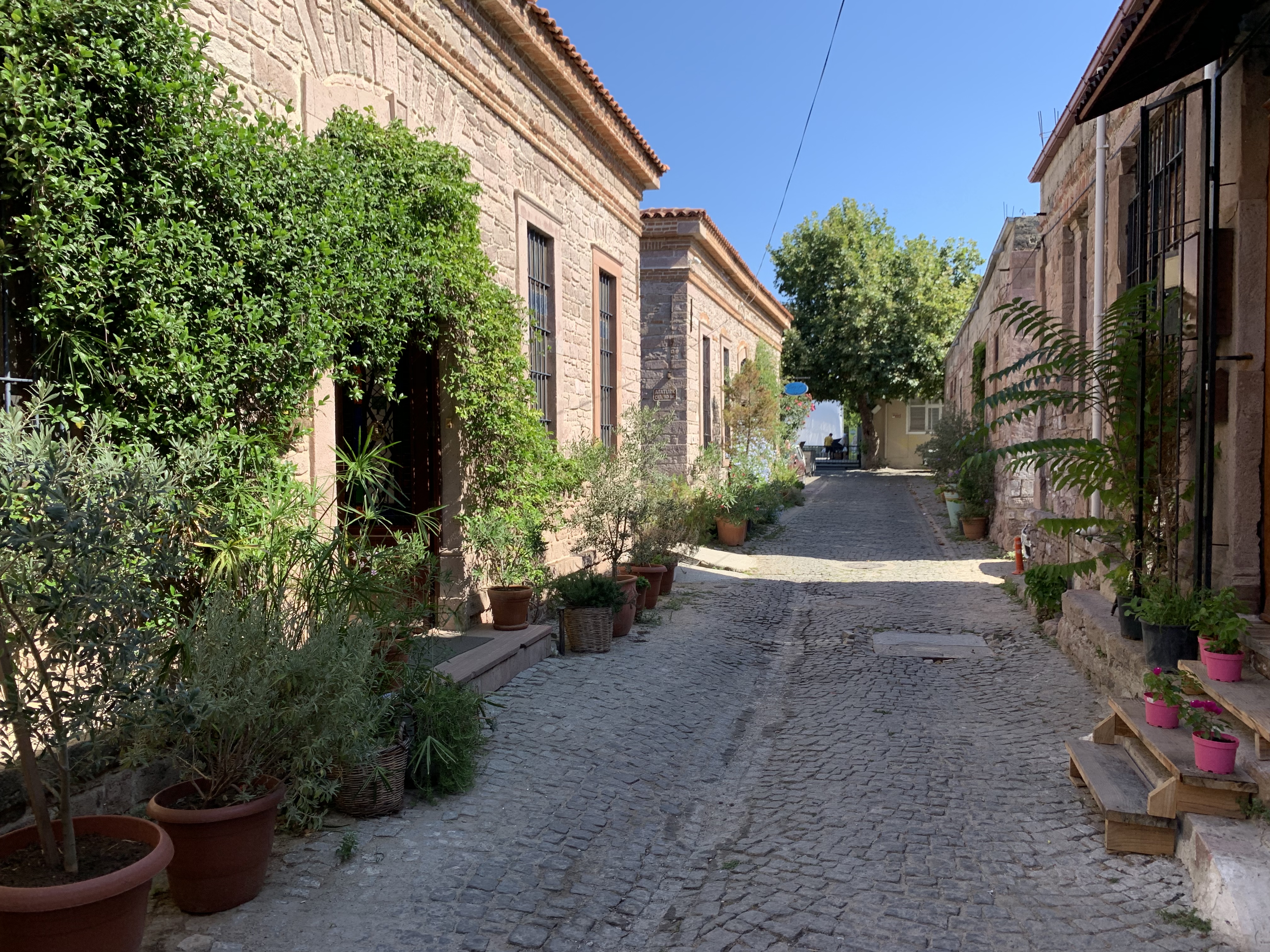 An hour’s drive away, I had been recommended to see Ayvalik. I reached the waterfront with no idea where to stay for the night. While cruising evening traffic I checked Google maps and found a hotel icon on a small road just beside where I was driving. Mentally I pressed the “I feel lucky” button and left the main road for a narrow alley. Around a corner an old stone house covered in a plant with a lot of green leaves and pink flowers turned out to be the hotel. As I walked in, across the corridor an open door led to a small wooden pier straight to the sea. The sun was about to go down on the hills on the other side of the bay, a boat moored in front of the terrace. Jackpot! The panorama for dinner, as the sun went down, competed strongly with the one at breakfast, with morning calm and few people around. This formerly Greek town, famous for its olive oil, had a lot of natural, laid back charm.